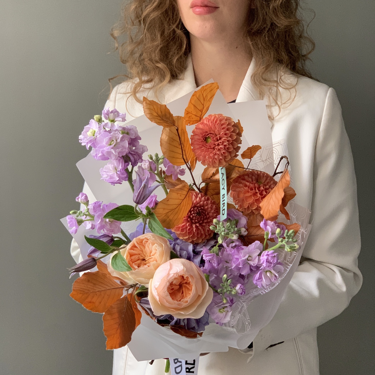 Свежие цветы от Lacy Bird доставляются в фирменной упаковке, которую необходимо снять при установке в вазу. Не срезайте ленту, связывающую букет для сохранения формы.