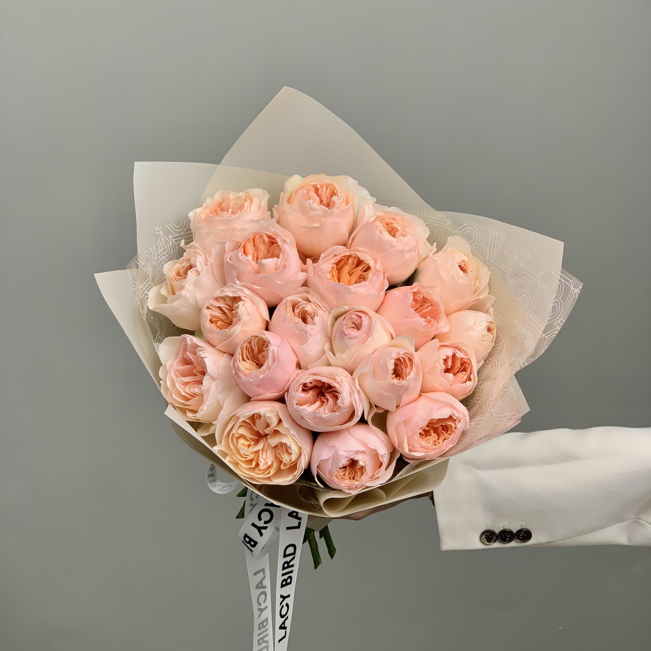 Свежие цветы от Lacy Bird доставляются в фирменной упаковке, которую необходимо снять при установке в вазу. Не срезайте ленту, связывающую букет для сохранения формы.