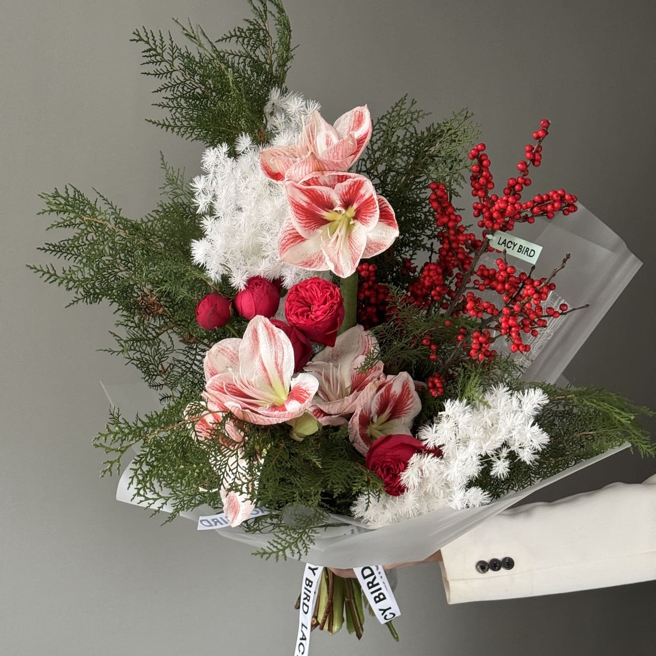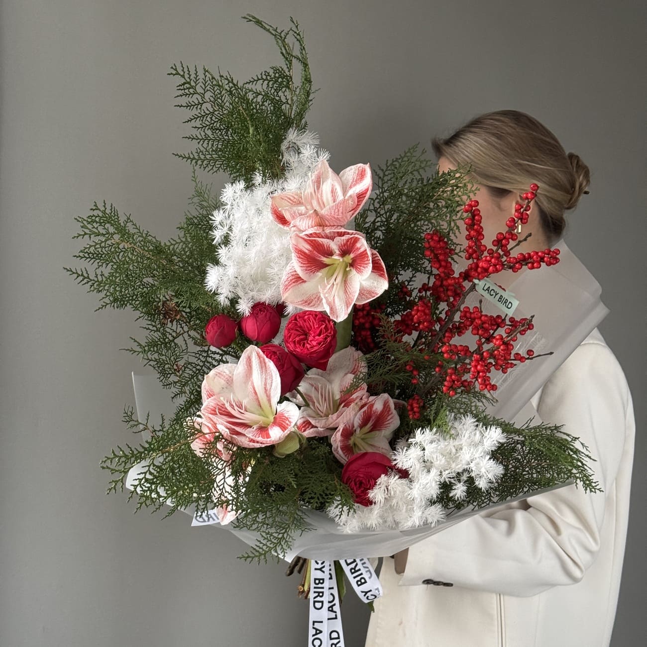 Свежие цветы от Lacy Bird доставляются в фирменной упаковке, которую необходимо снять при установке в вазу. Не срезайте ленту, связывающую букет для сохранения формы.