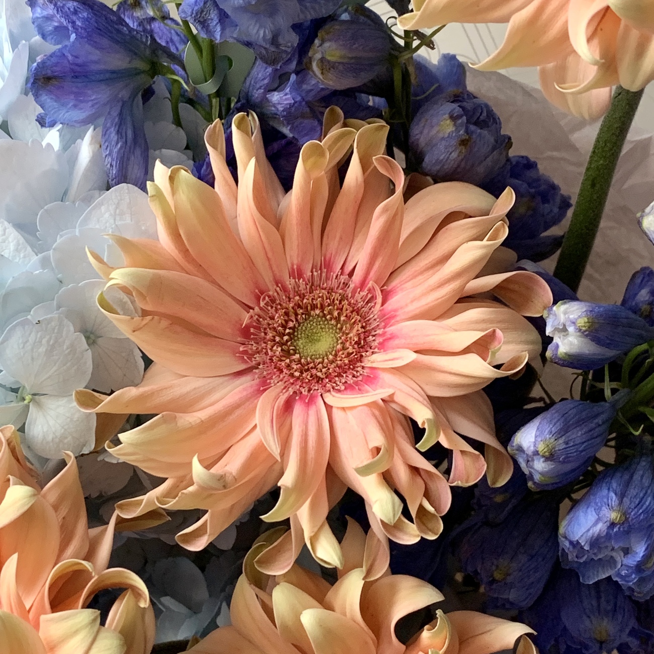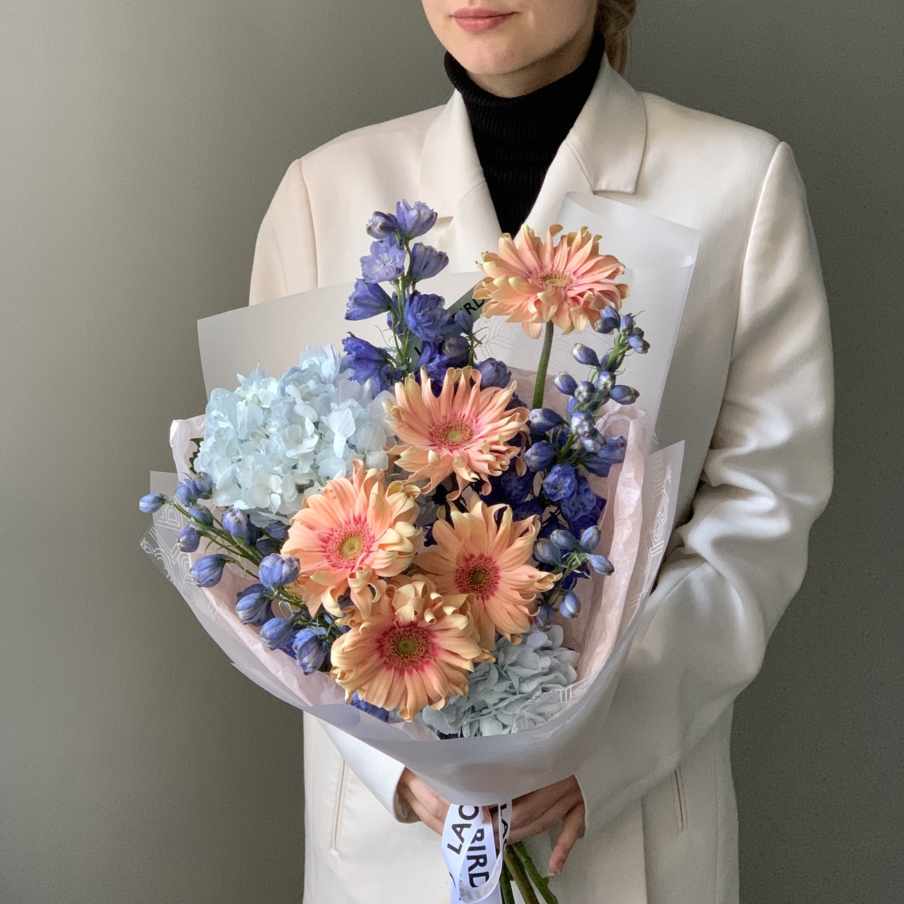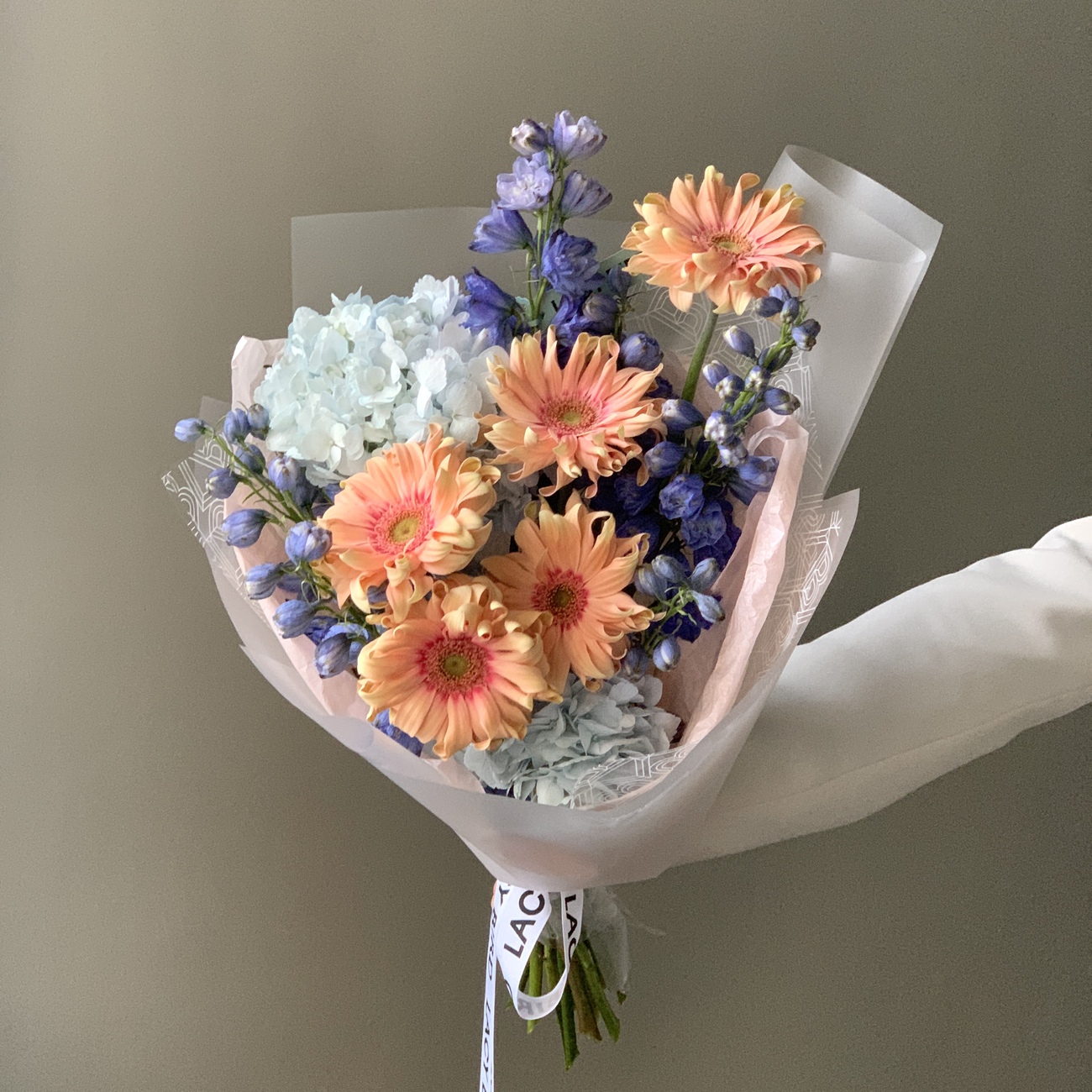 Свежие цветы от Lacy Bird доставляются в фирменной упаковке, которую необходимо снять при установке в вазу. Не срезайте ленту, связывающую букет для сохранения формы.