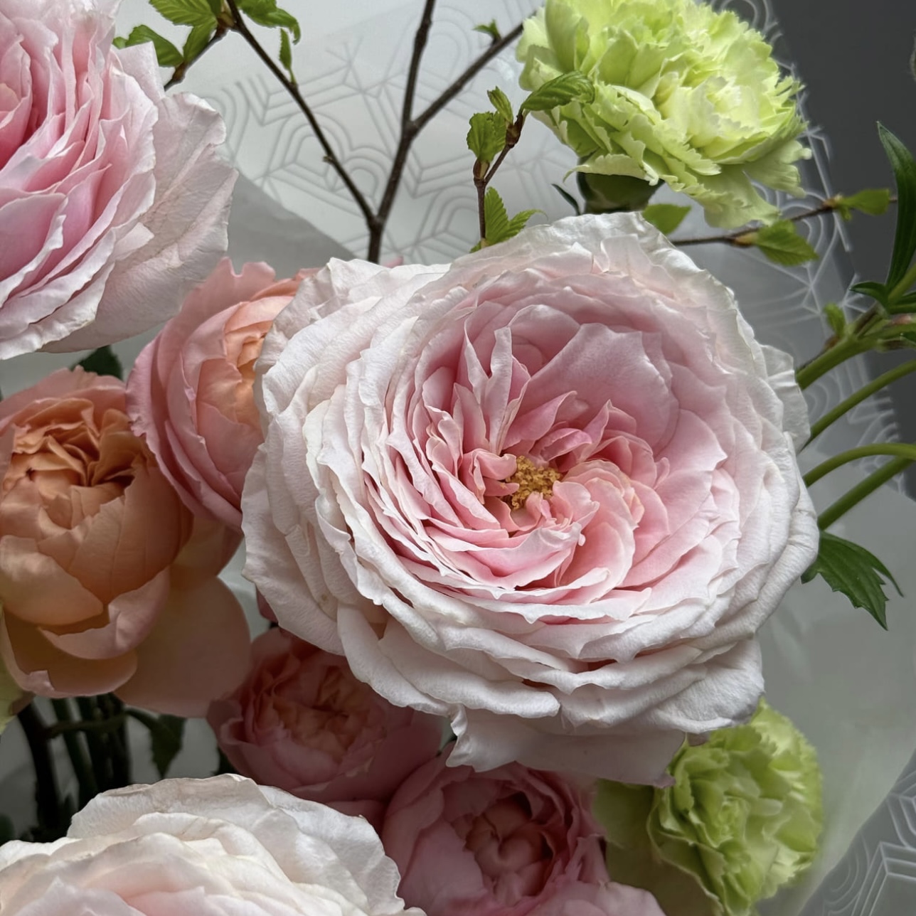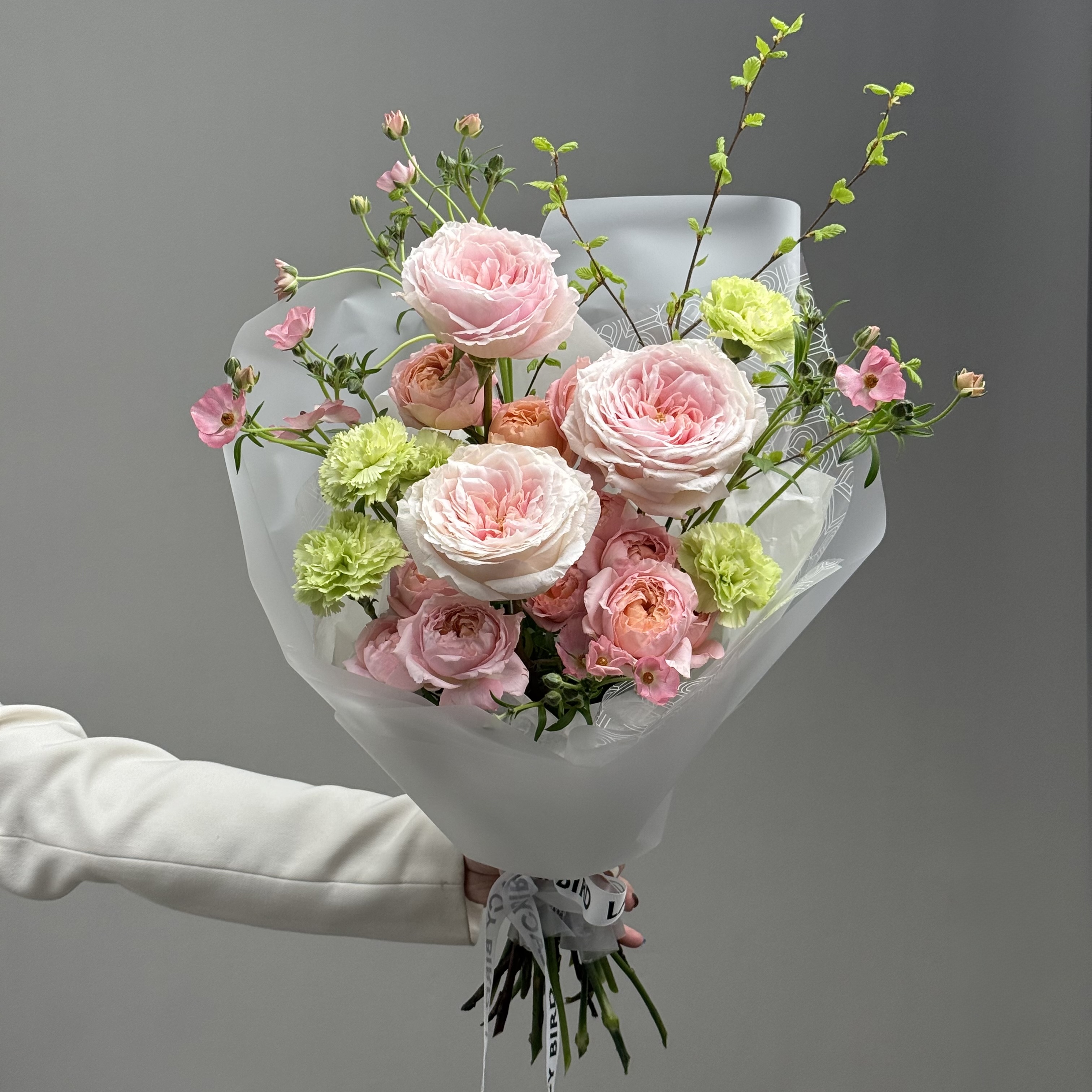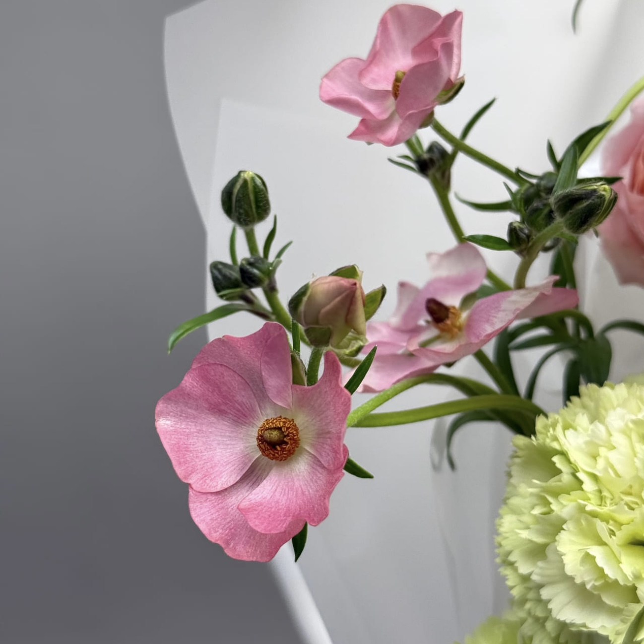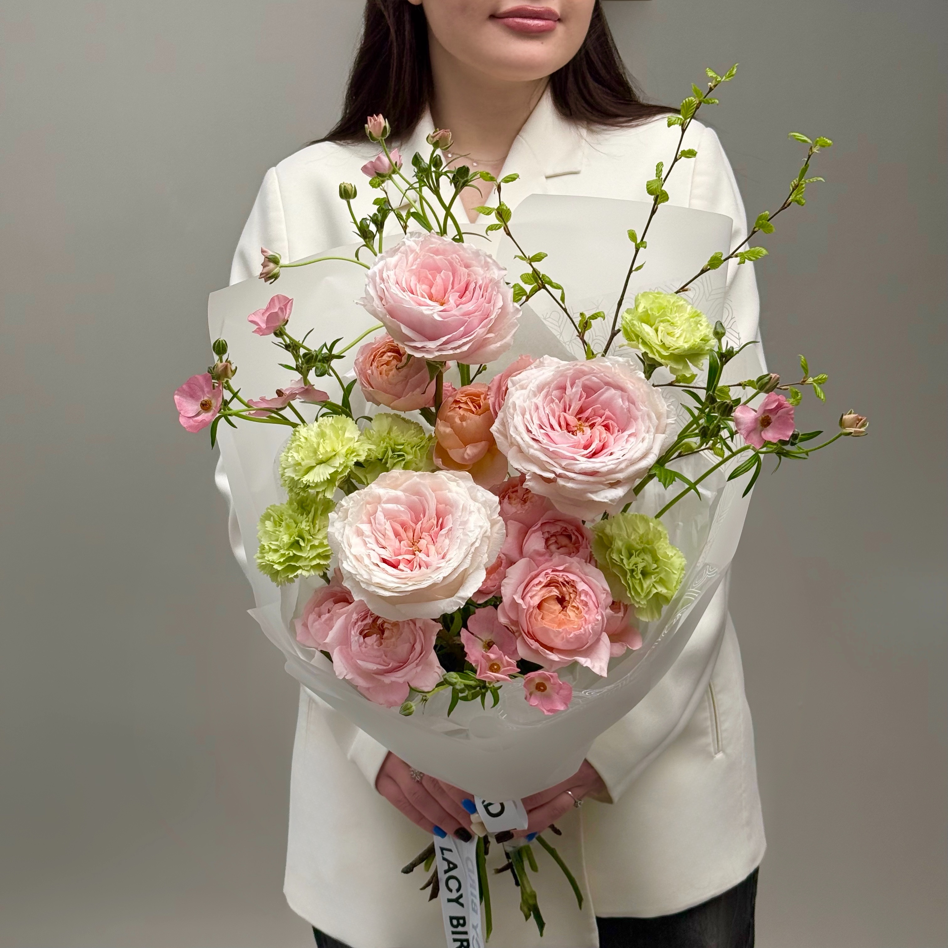 Свежие цветы от Lacy Bird доставляются в фирменной упаковке, которую необходимо снять при установке в вазу. Не срезайте ленту, связывающую букет для сохранения формы.
