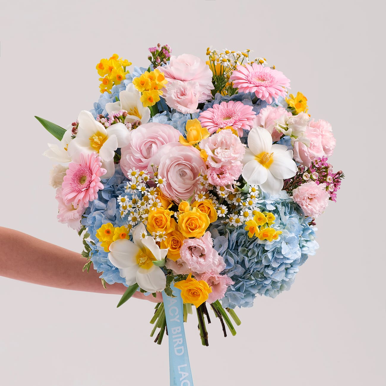 Свежие цветы от Lacy Bird доставляются в фирменной упаковке, которую необходимо снять при установке в вазу. Не срезайте ленту, связывающую букет для сохранения формы.