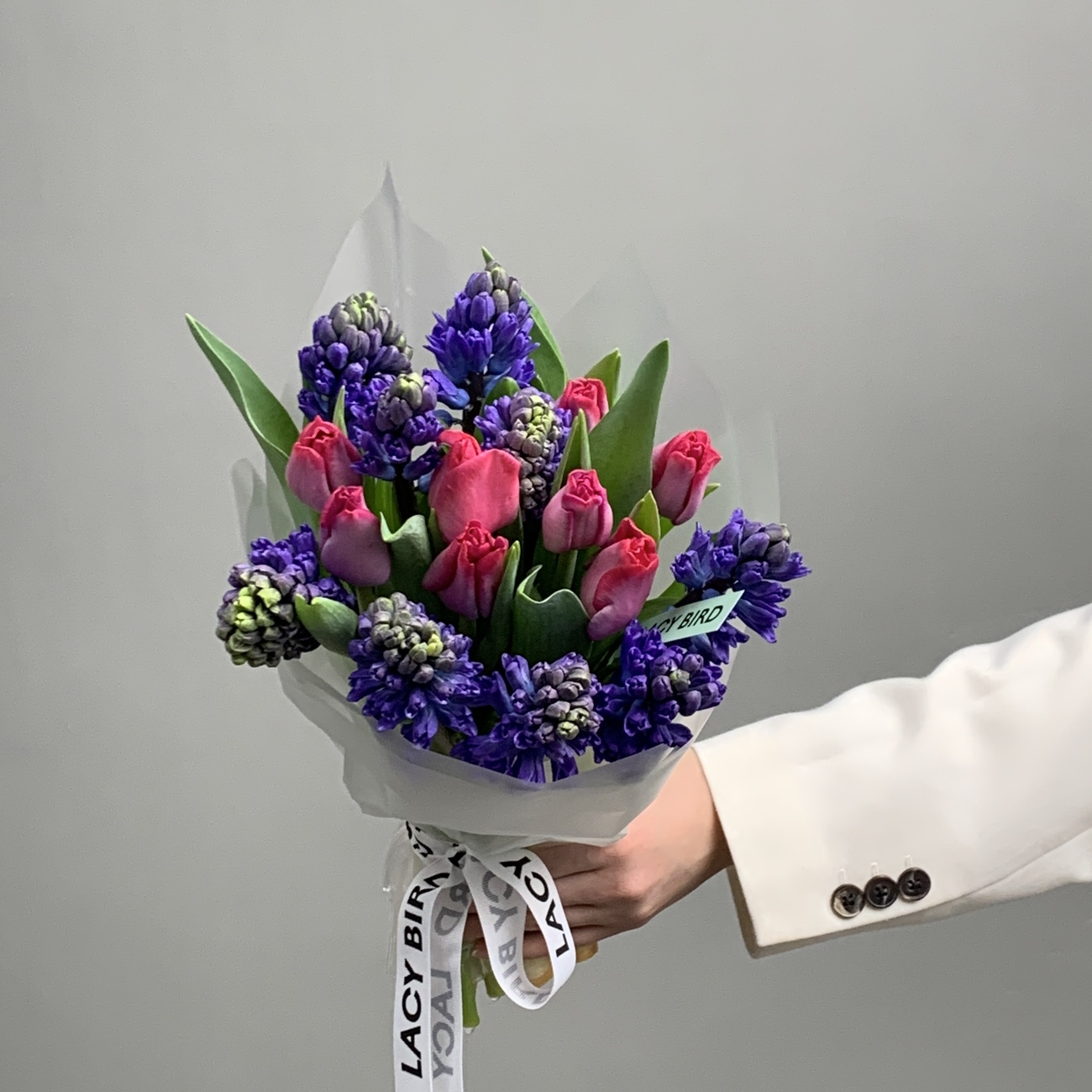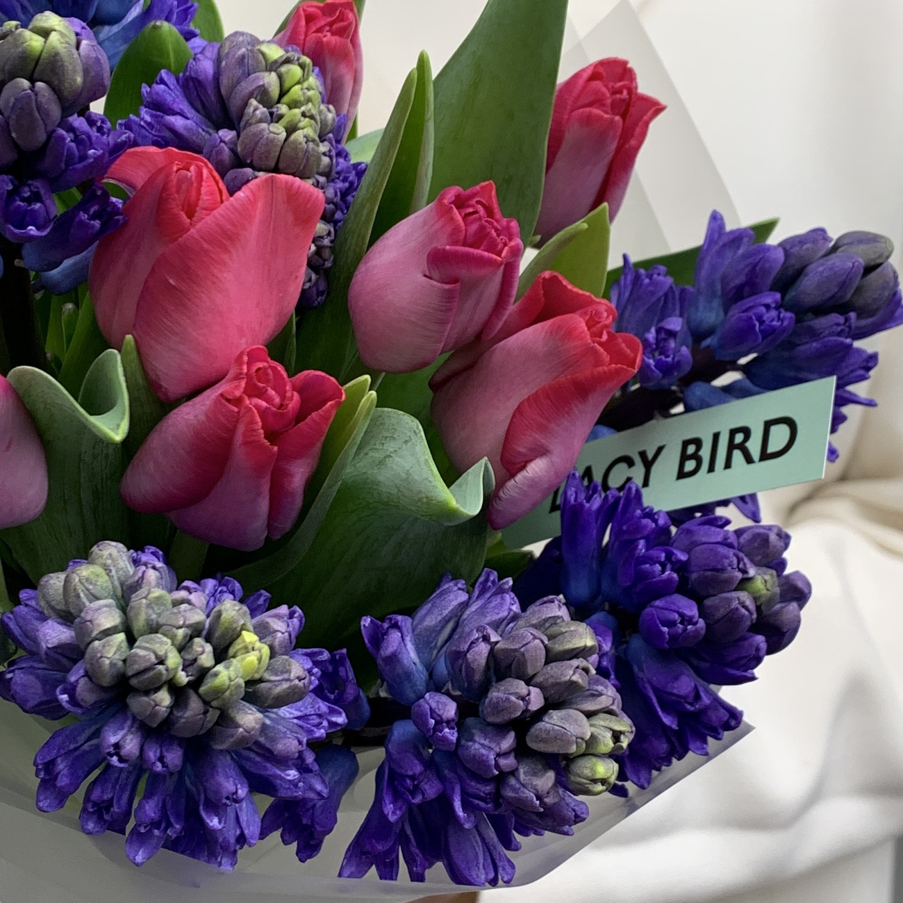 Свежие цветы от Lacy Bird доставляются в фирменной упаковке, которую необходимо снять при установке в вазу. Не срезайте ленту, связывающую букет для сохранения формы.