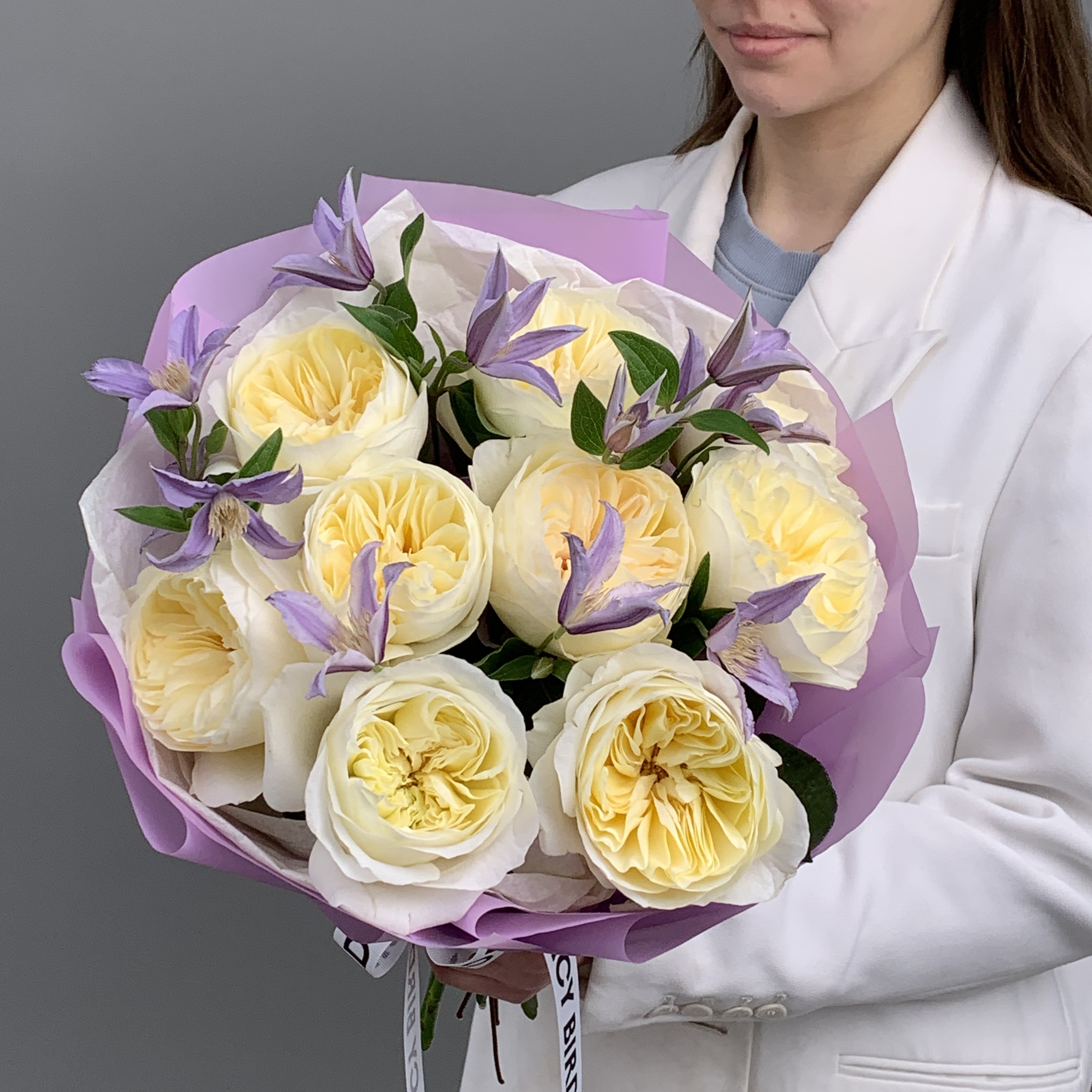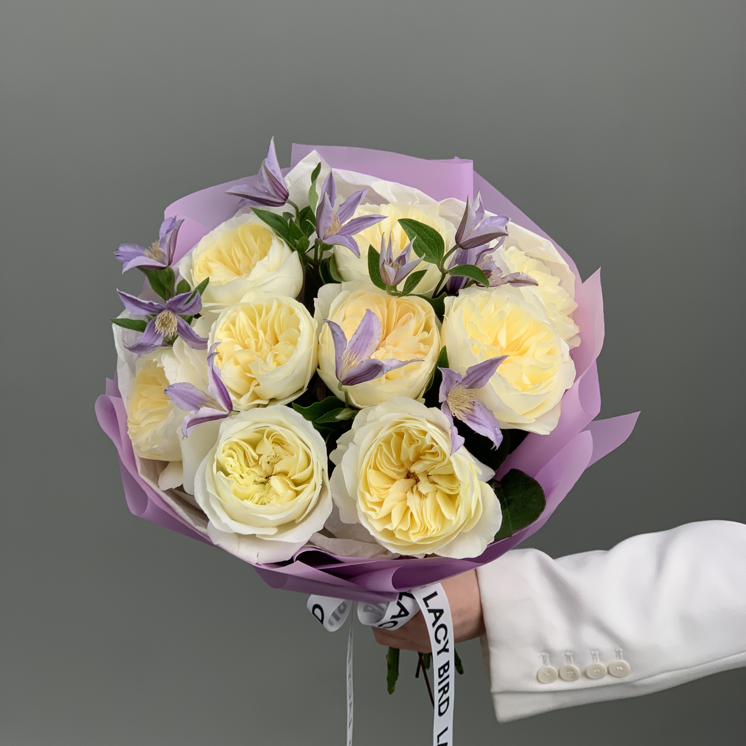 Свежие цветы от Lacy Bird доставляются в фирменной упаковке, которую необходимо снять при установке в вазу. Не срезайте ленту, связывающую букет для сохранения формы.