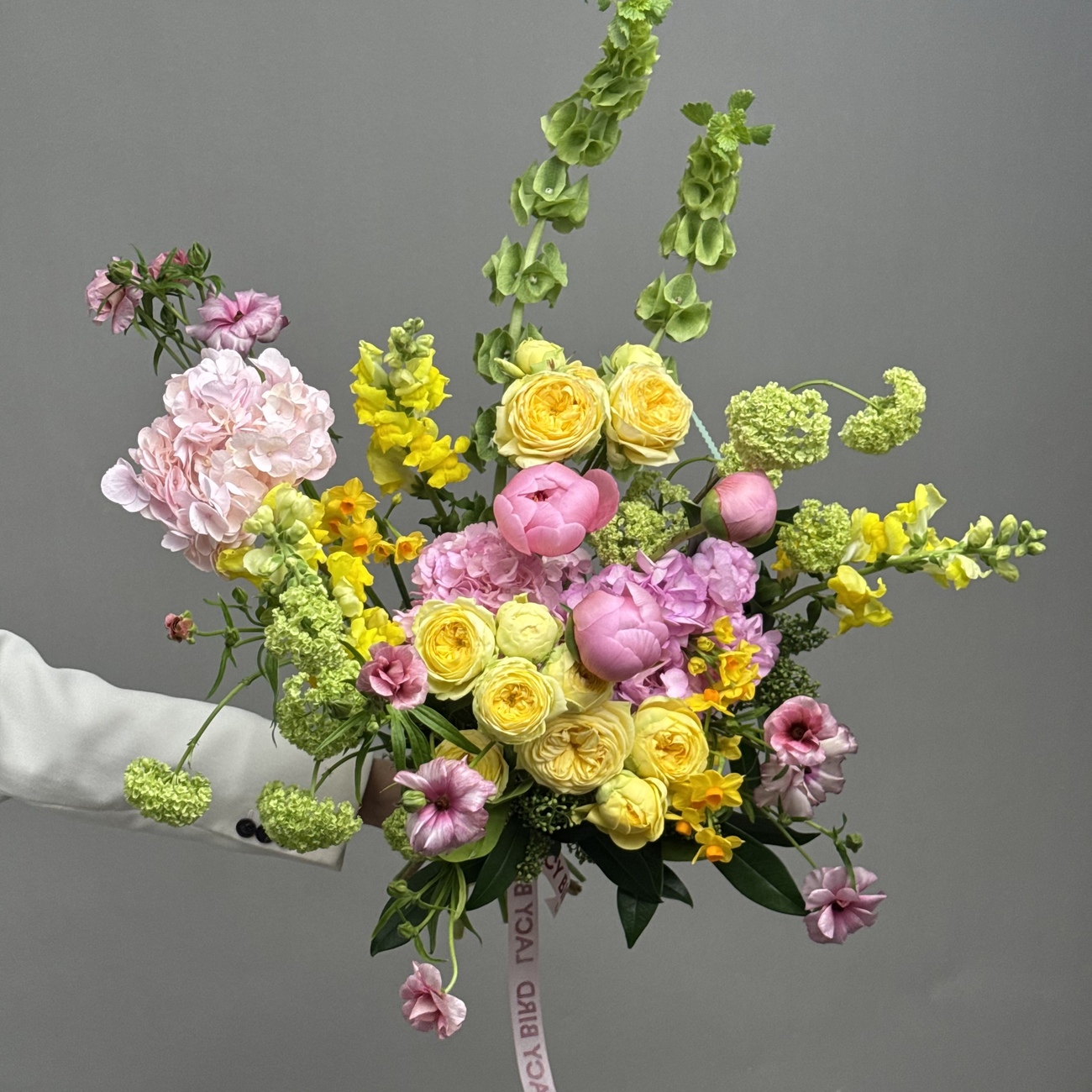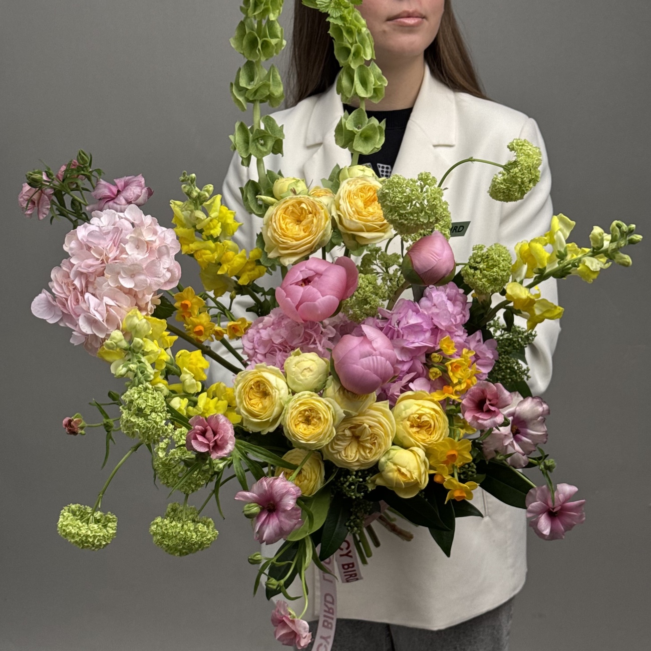 Свежие цветы от Lacy Bird доставляются в фирменной упаковке, которую необходимо снять при установке в вазу. Не срезайте ленту, связывающую букет для сохранения формы.