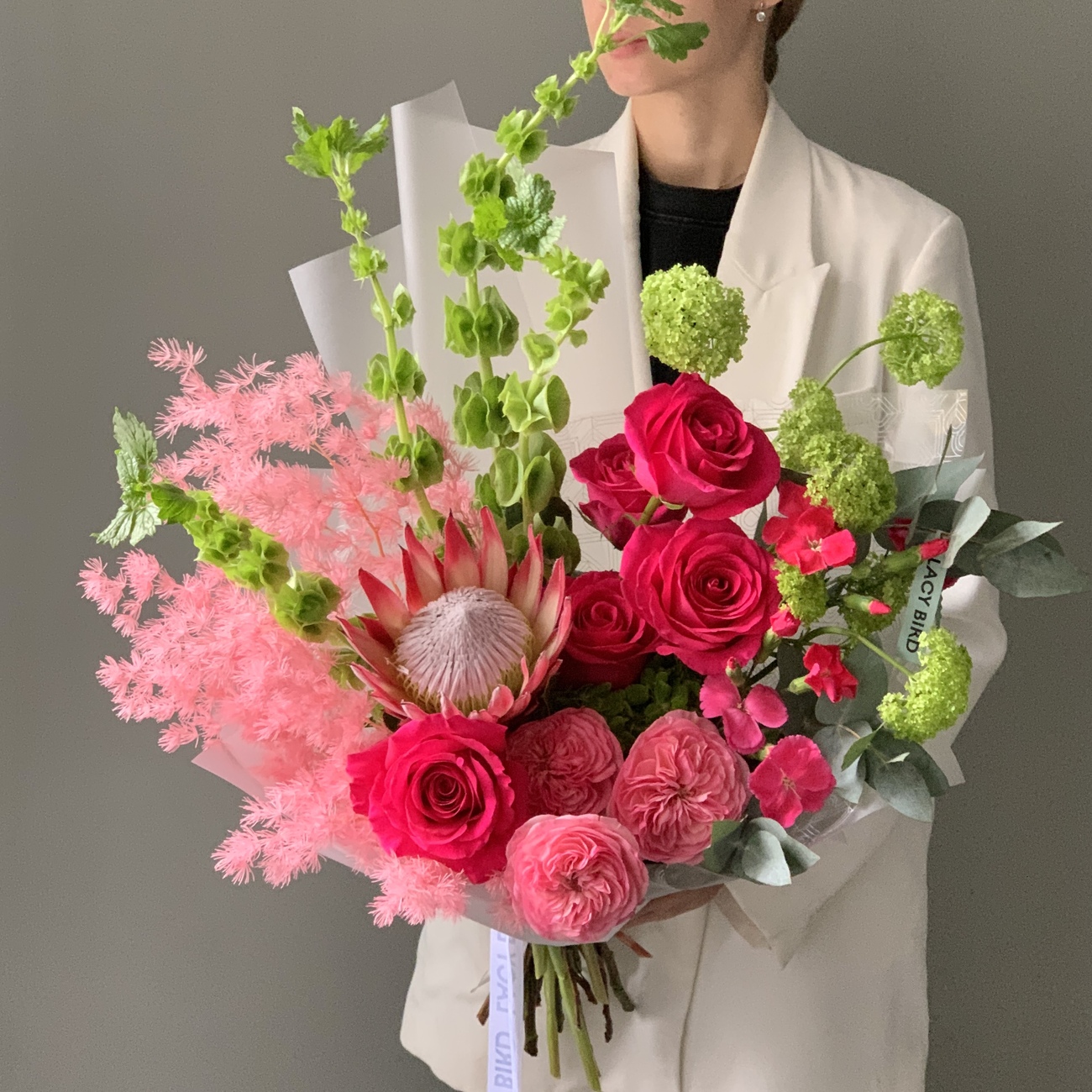 Свежие цветы от Lacy Bird доставляются в фирменной упаковке, которую необходимо снять при установке в вазу. Не срезайте ленту, связывающую букет для сохранения формы.