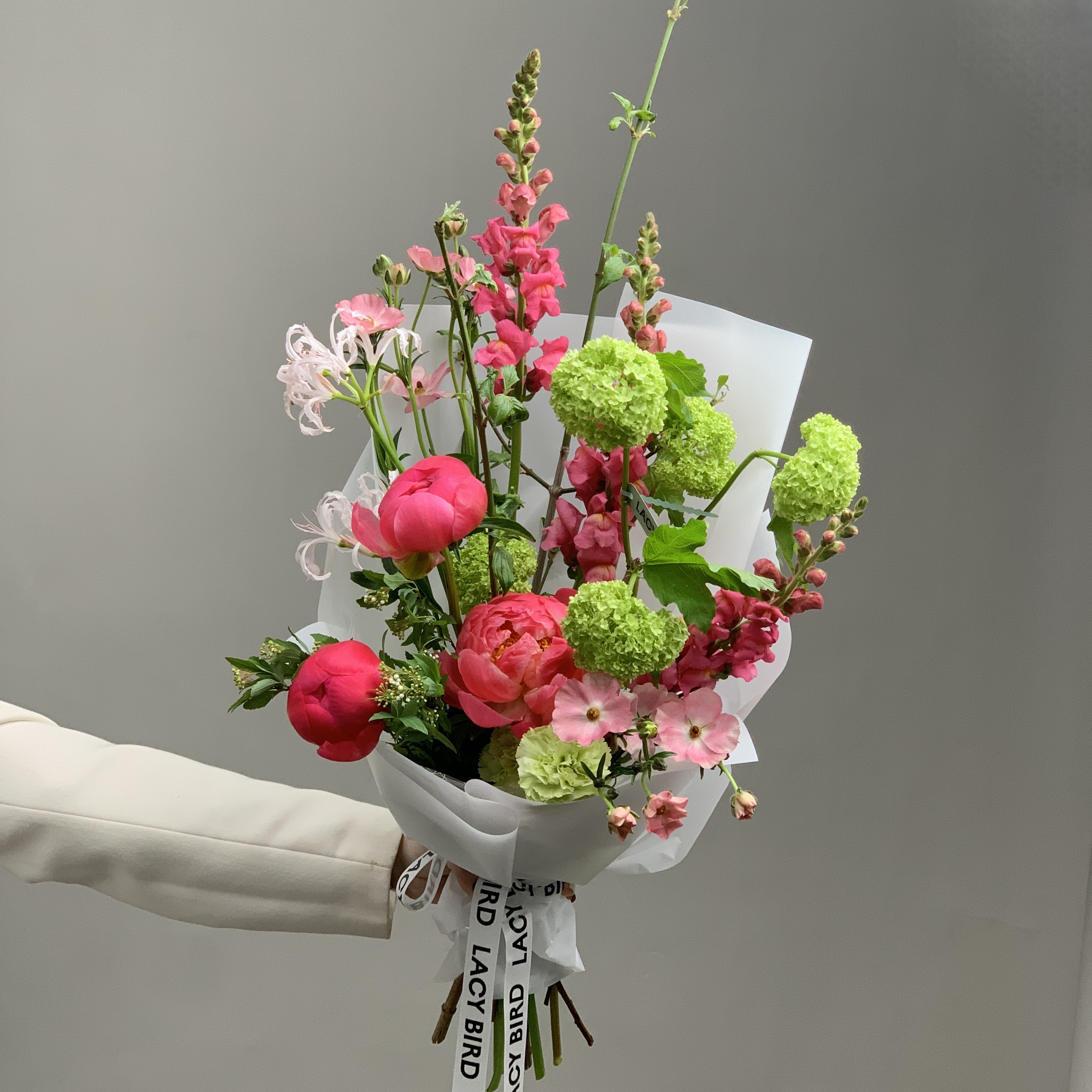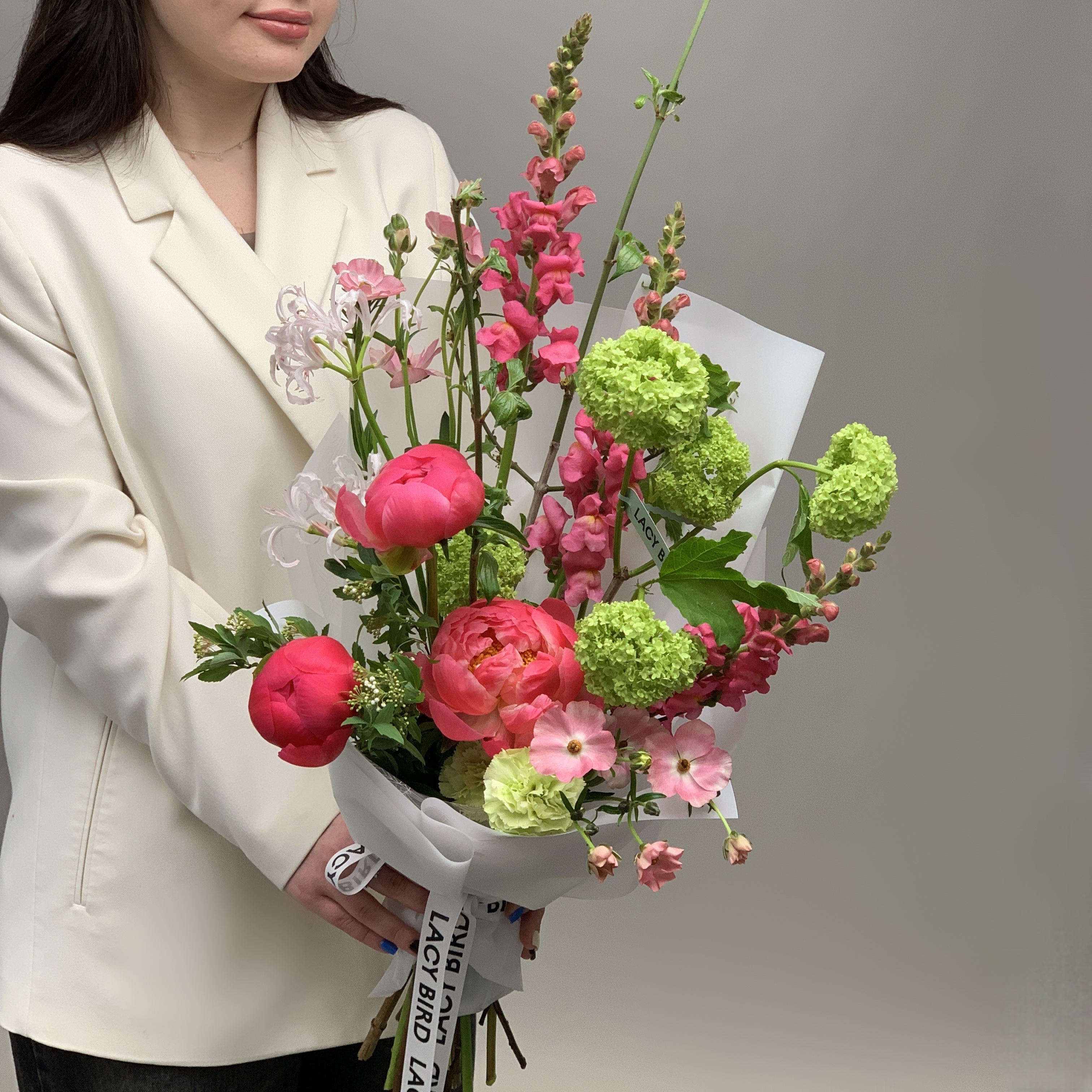 Свежие цветы от Lacy Bird доставляются в фирменной упаковке, которую необходимо снять при установке в вазу. Не срезайте ленту, связывающую букет для сохранения формы.