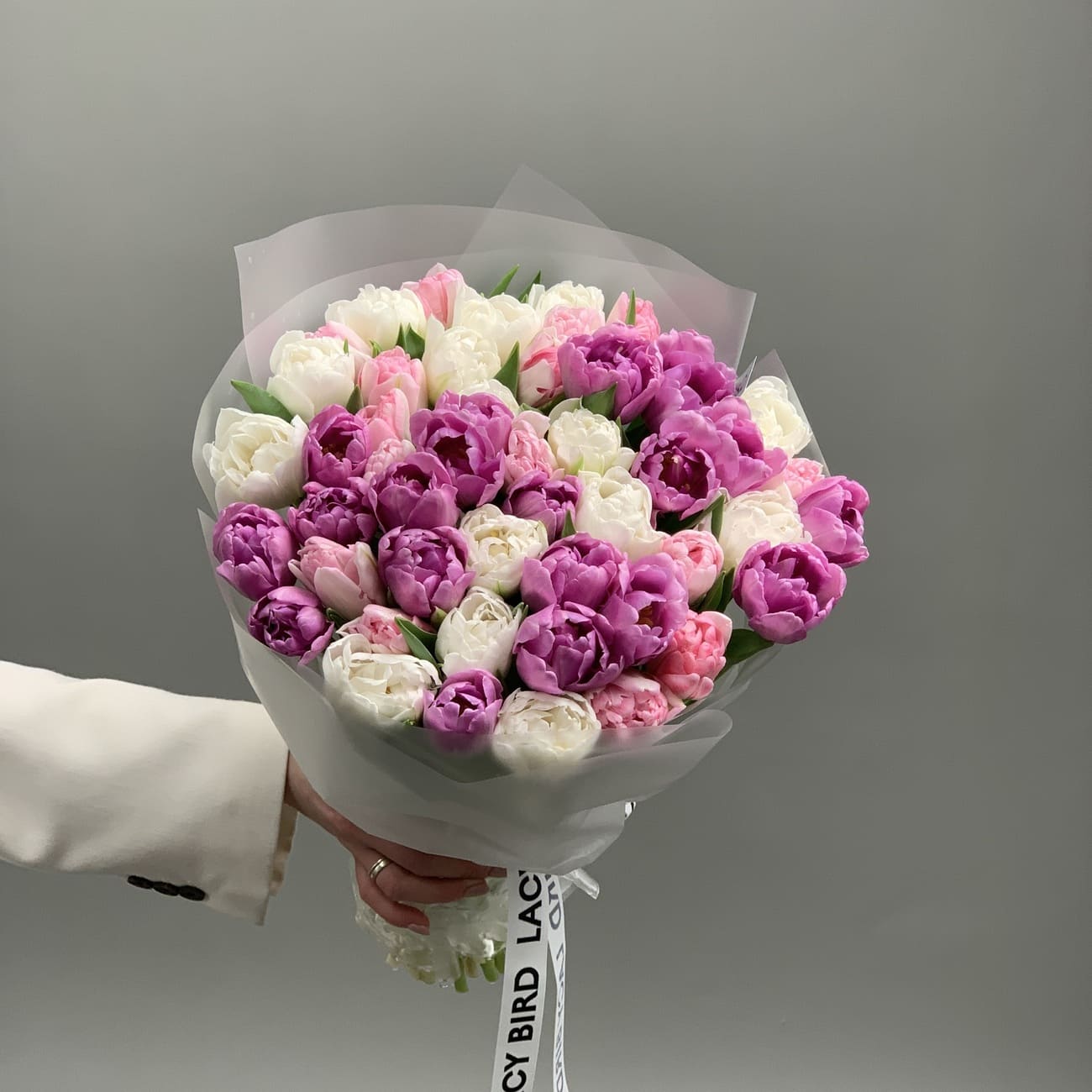 Свежие цветы от Lacy Bird доставляются в фирменной упаковке, которую необходимо снять при установке в вазу. Не срезайте ленту, связывающую букет для сохранения формы.