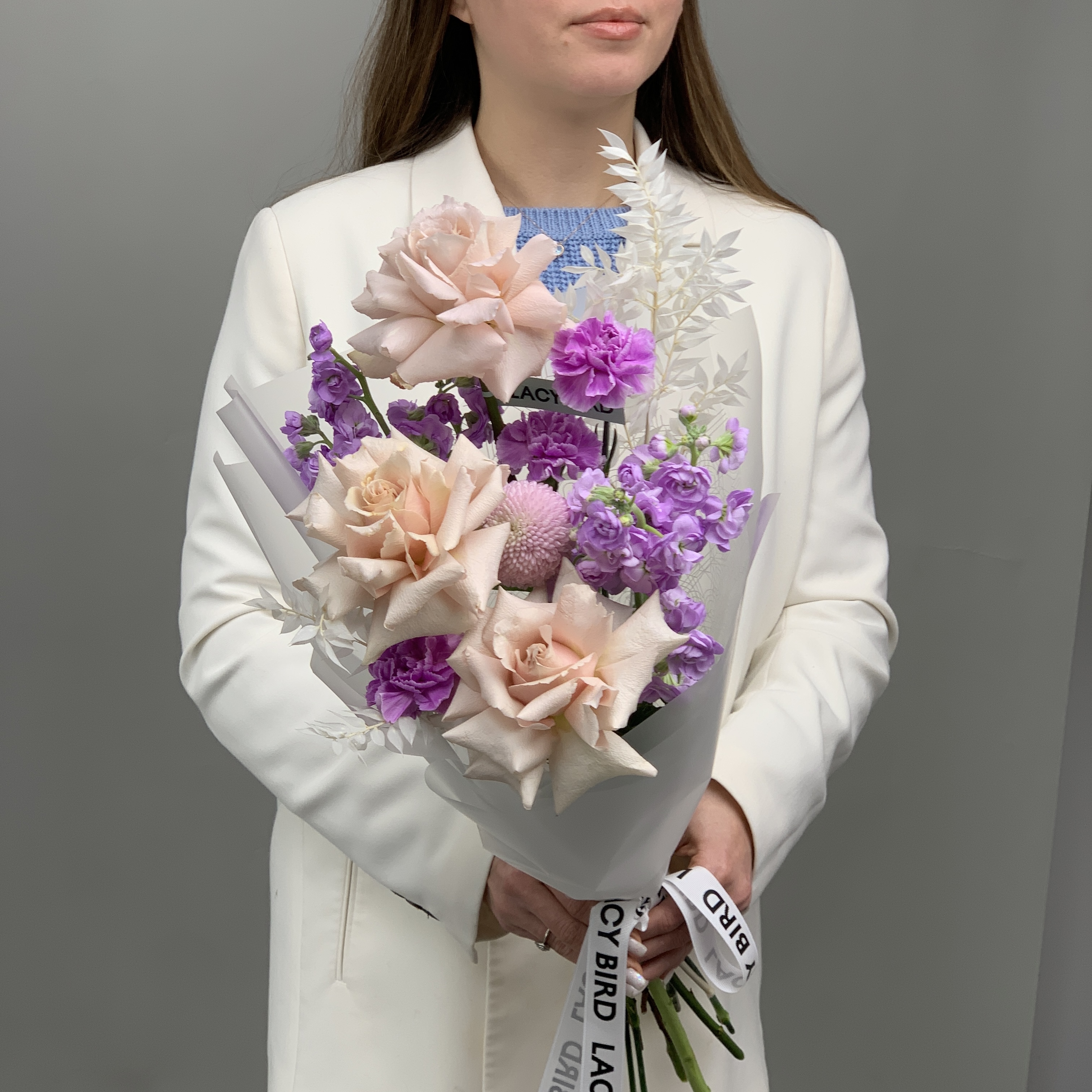 Свежие цветы от Lacy Bird доставляются в фирменной упаковке, которую необходимо снять при установке в вазу. Не срезайте ленту, связывающую букет для сохранения формы.