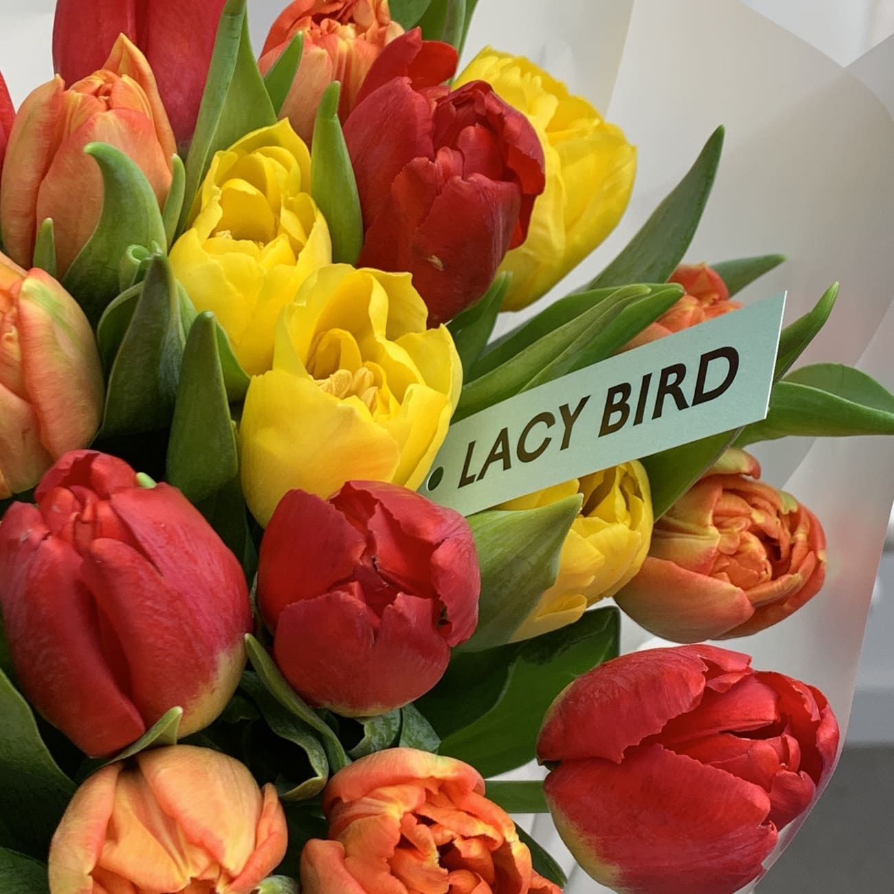 Свежие цветы от Lacy Bird доставляются в фирменной упаковке, которую необходимо снять при установке в вазу. Не срезайте ленту, связывающую букет для сохранения формы.