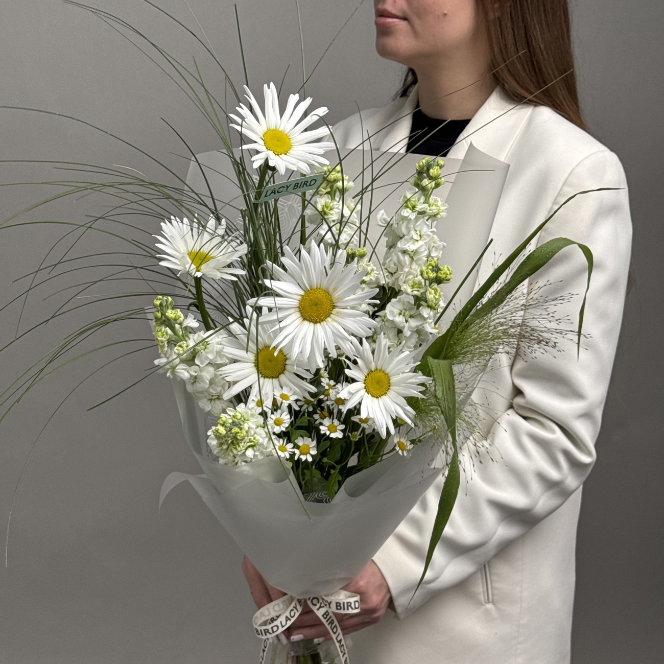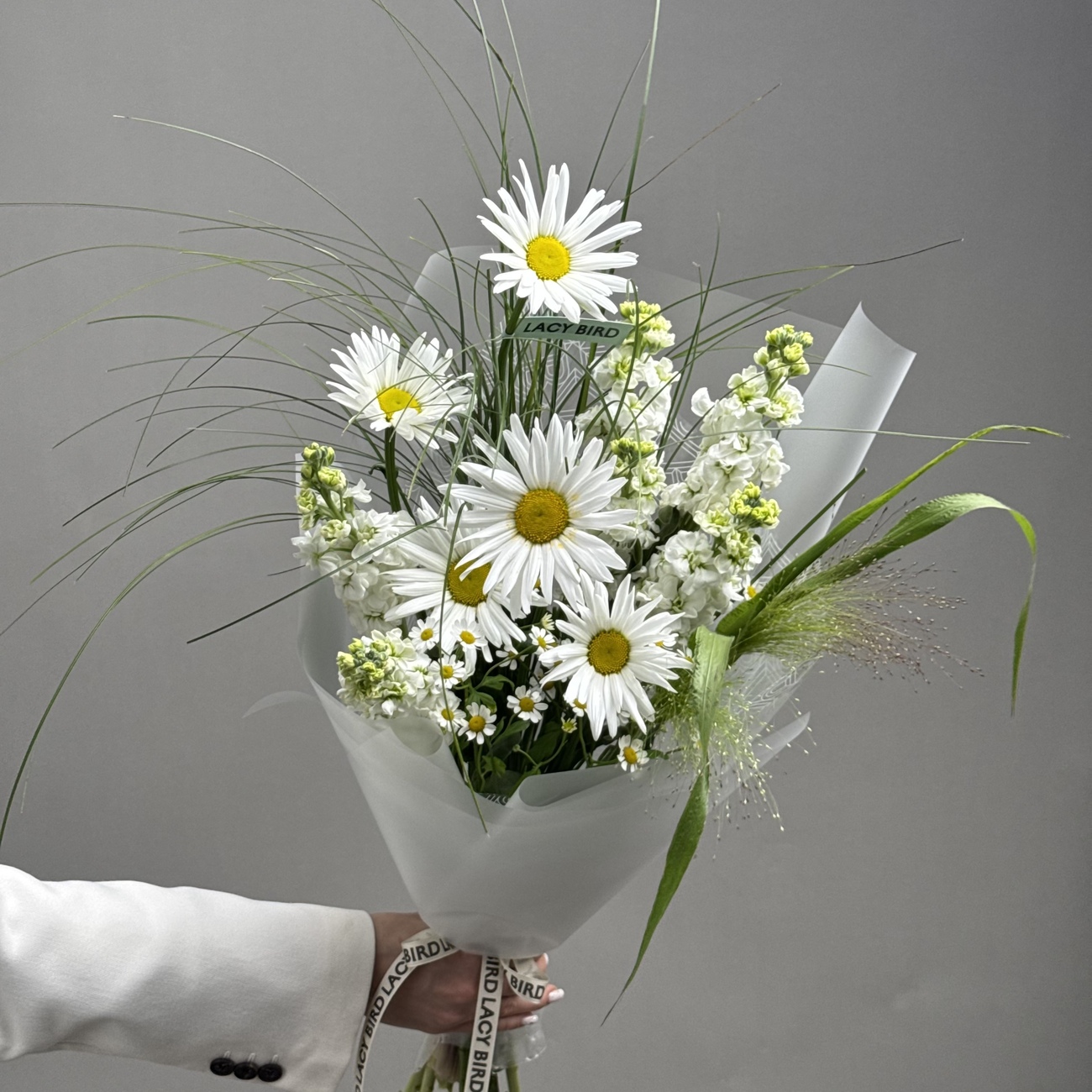 Свежие цветы от Lacy Bird доставляются в фирменной упаковке, которую необходимо снять при установке в вазу. Не срезайте ленту, связывающую букет для сохранения формы.