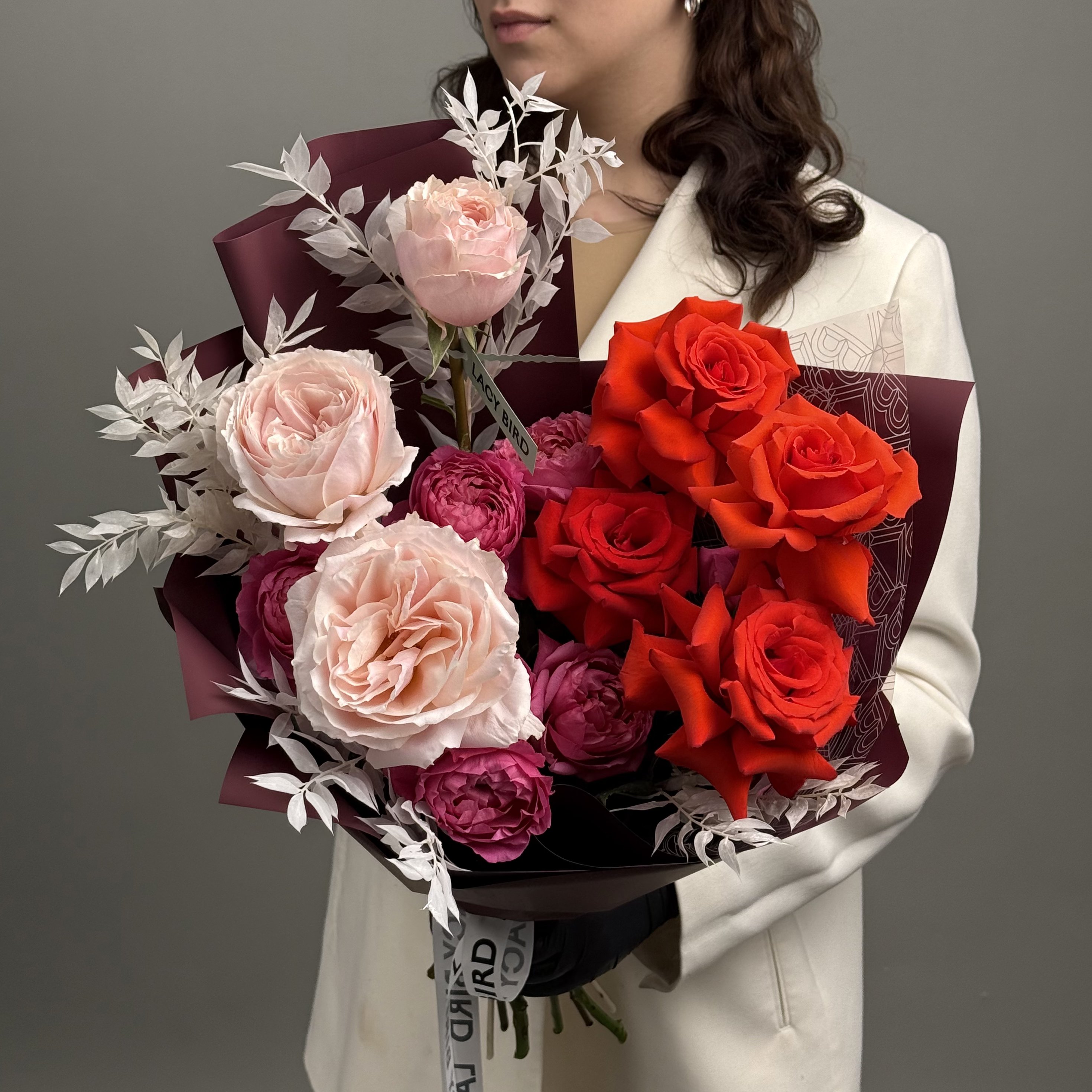 Свежие цветы от Lacy Bird доставляются в фирменной упаковке, которую необходимо снять при установке в вазу. Не срезайте ленту, связывающую букет для сохранения формы.