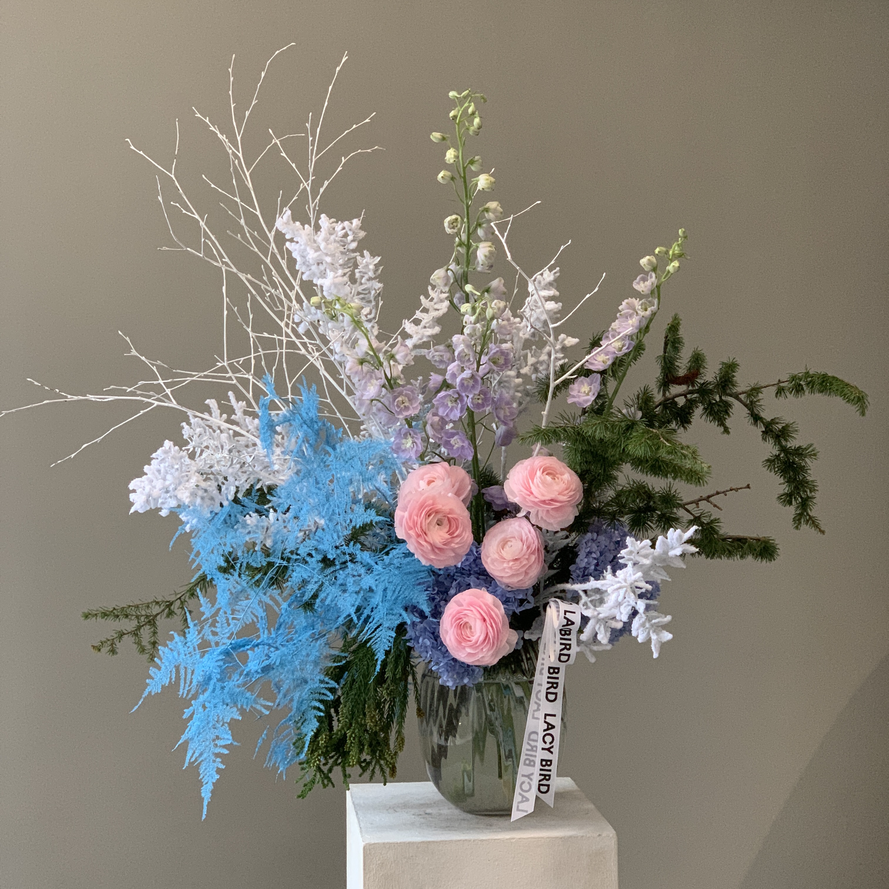 Свежие цветы от Lacy Bird доставляются в фирменной упаковке, которую необходимо снять при установке в вазу. Не срезайте ленту, связывающую букет для сохранения формы.