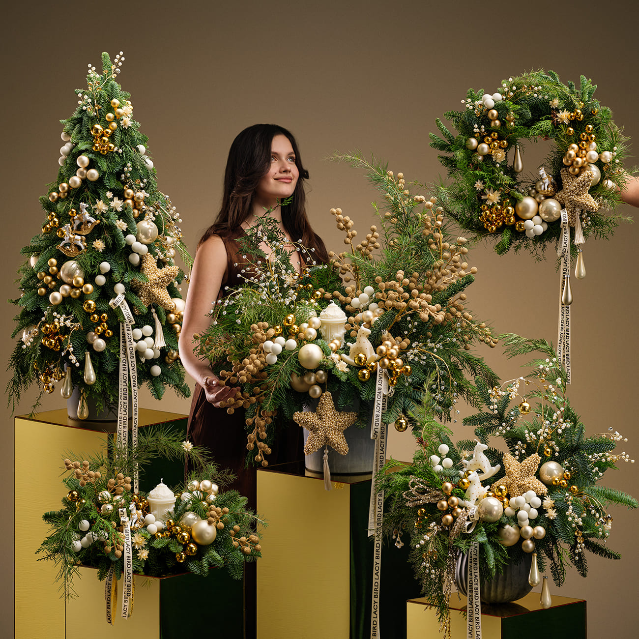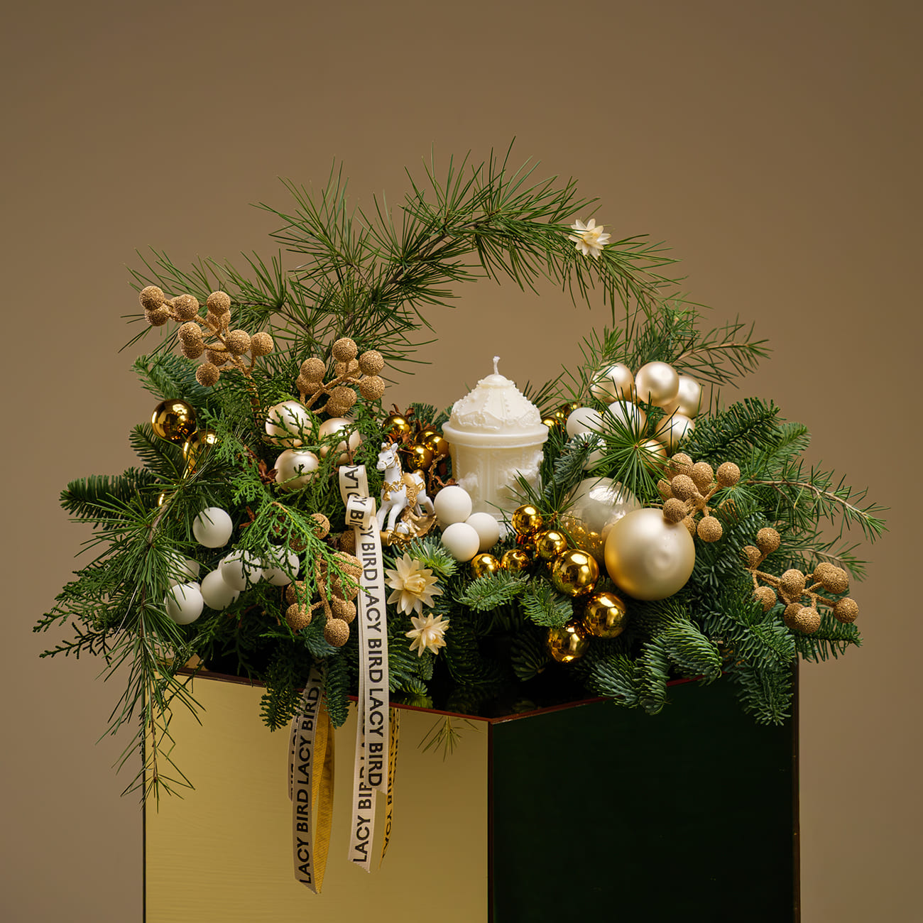 Он создан из живой хвои разных видов, украшен стеклянными шарами благородного золотого и белого цветов. Звезды, декорированные россыпью жемчужных бусин, ветки с кристаллами, сахарные ягоды и фигурки лошадок добавляют композициям особое очарование. А свечи в форме лошадок и карусели будут прекрасным украшением вашего интерьера и привнесут тепло в холодные зимние вечера.