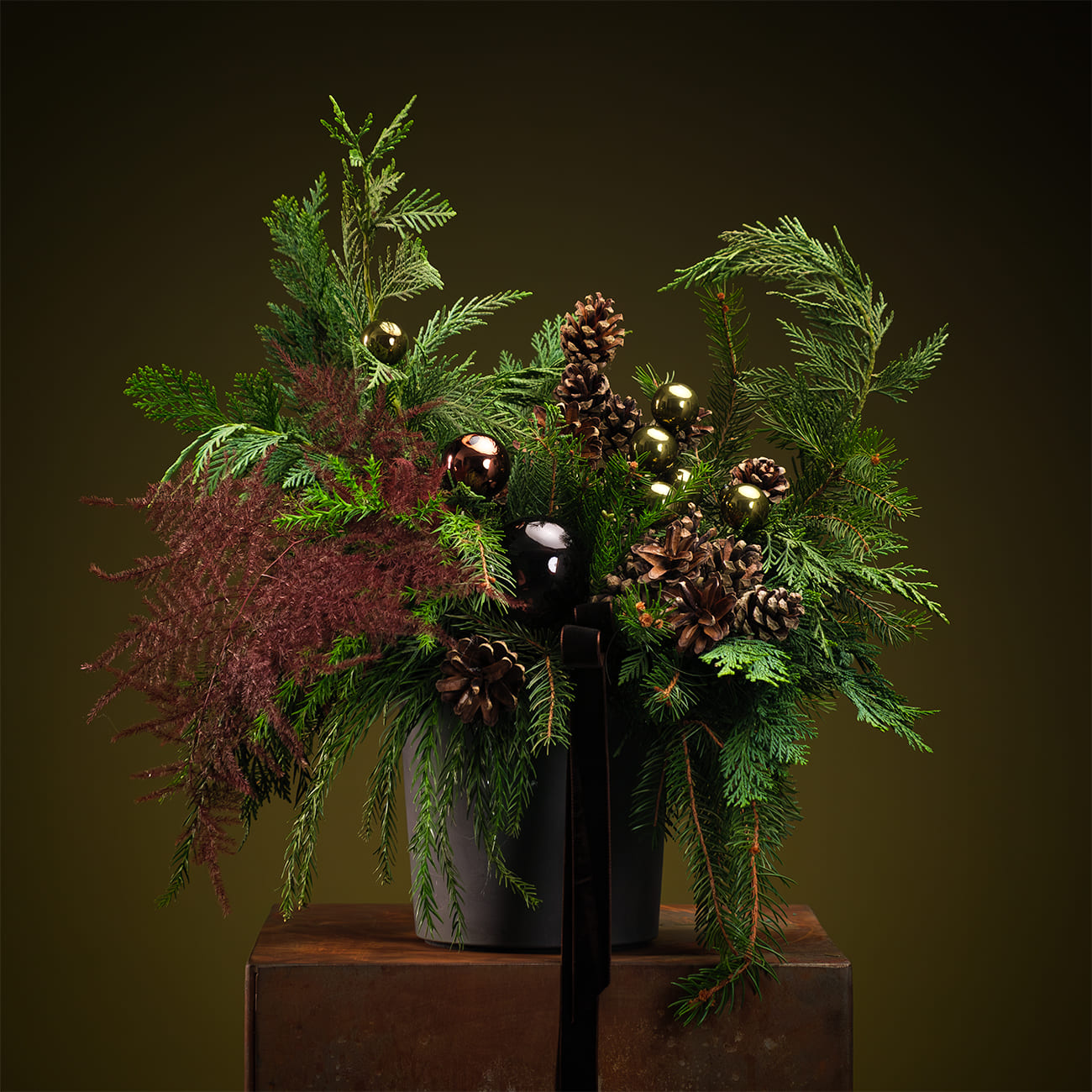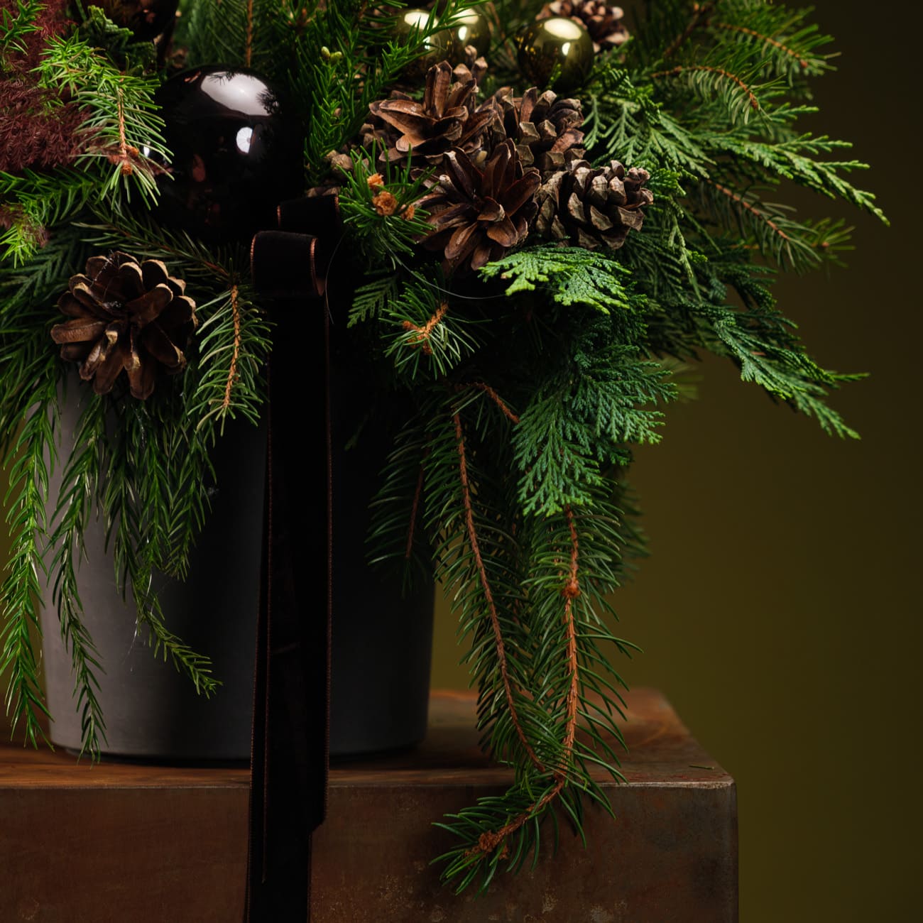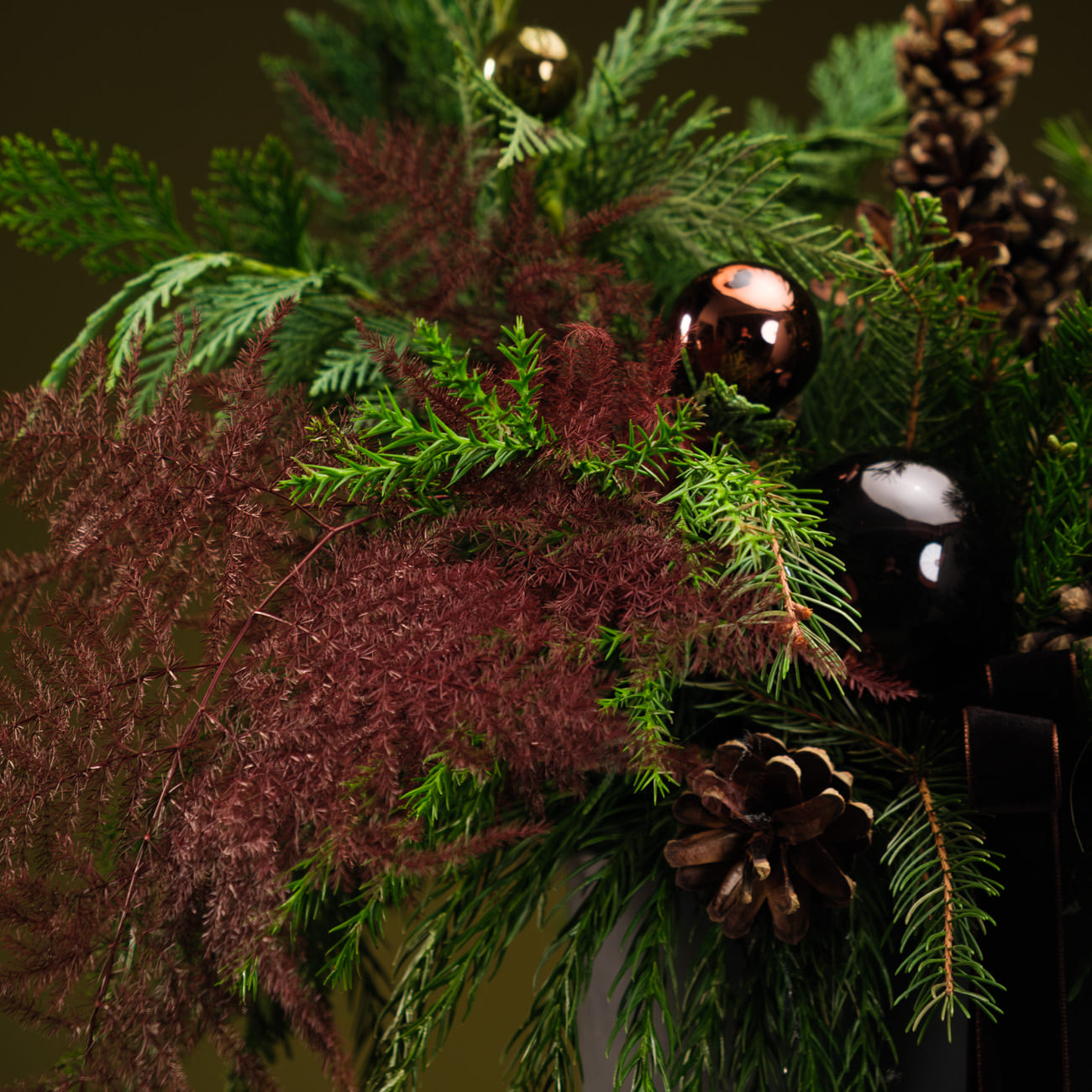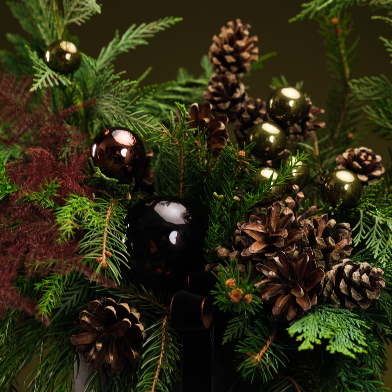 Композиция создана из живой хвои разных видов, натуральных шишек и веток аспарагуса цвета марсала. Декорирована стеклянными шарами коричневых, зеленых оттенков и бархатной лентой.