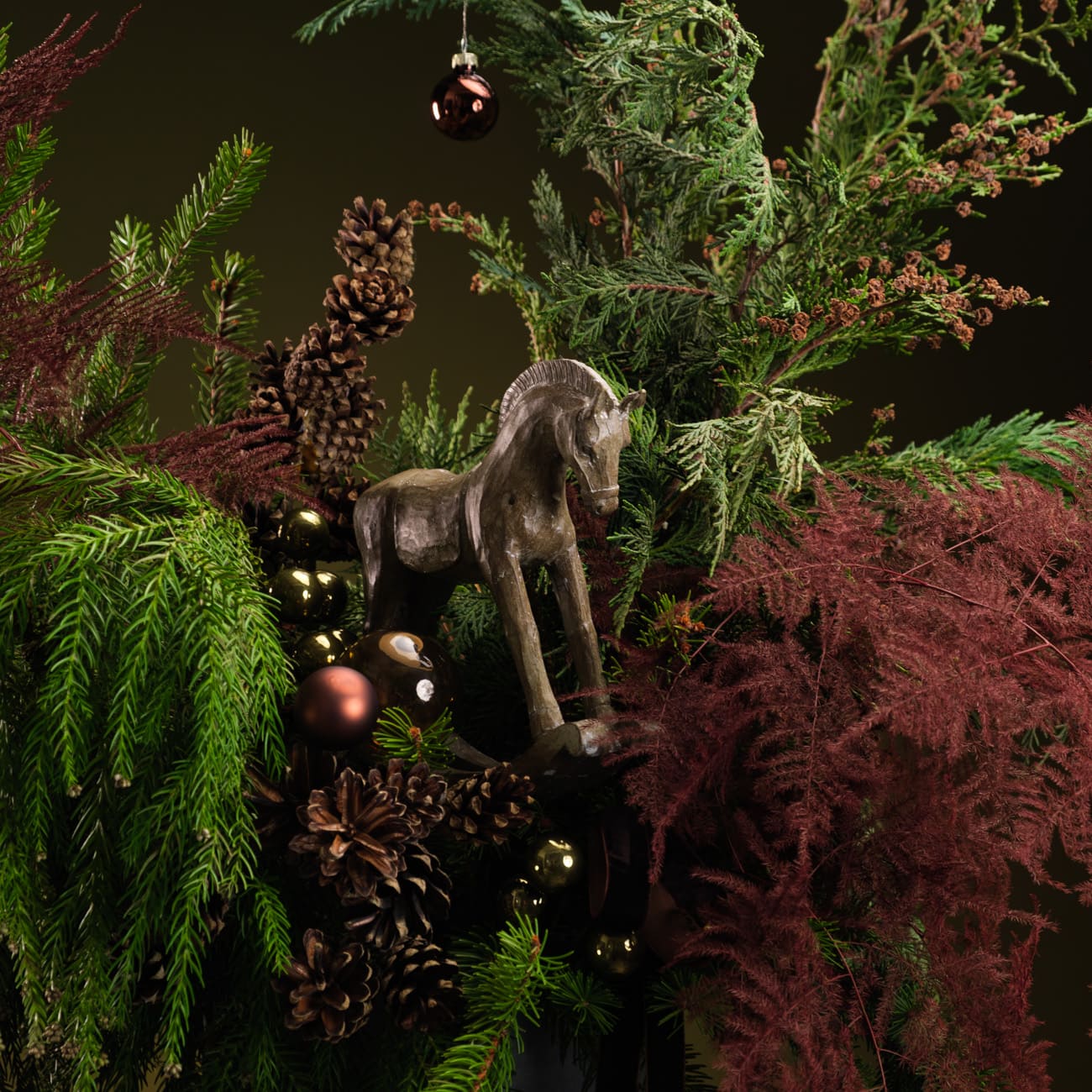 Композиции созданы из живой хвои разных видов, натуральных шишек и веток аспарагуса цвета марсала. Декорированы стеклянными шарами коричневых, зеленых оттенков и фигуркой лошадки.