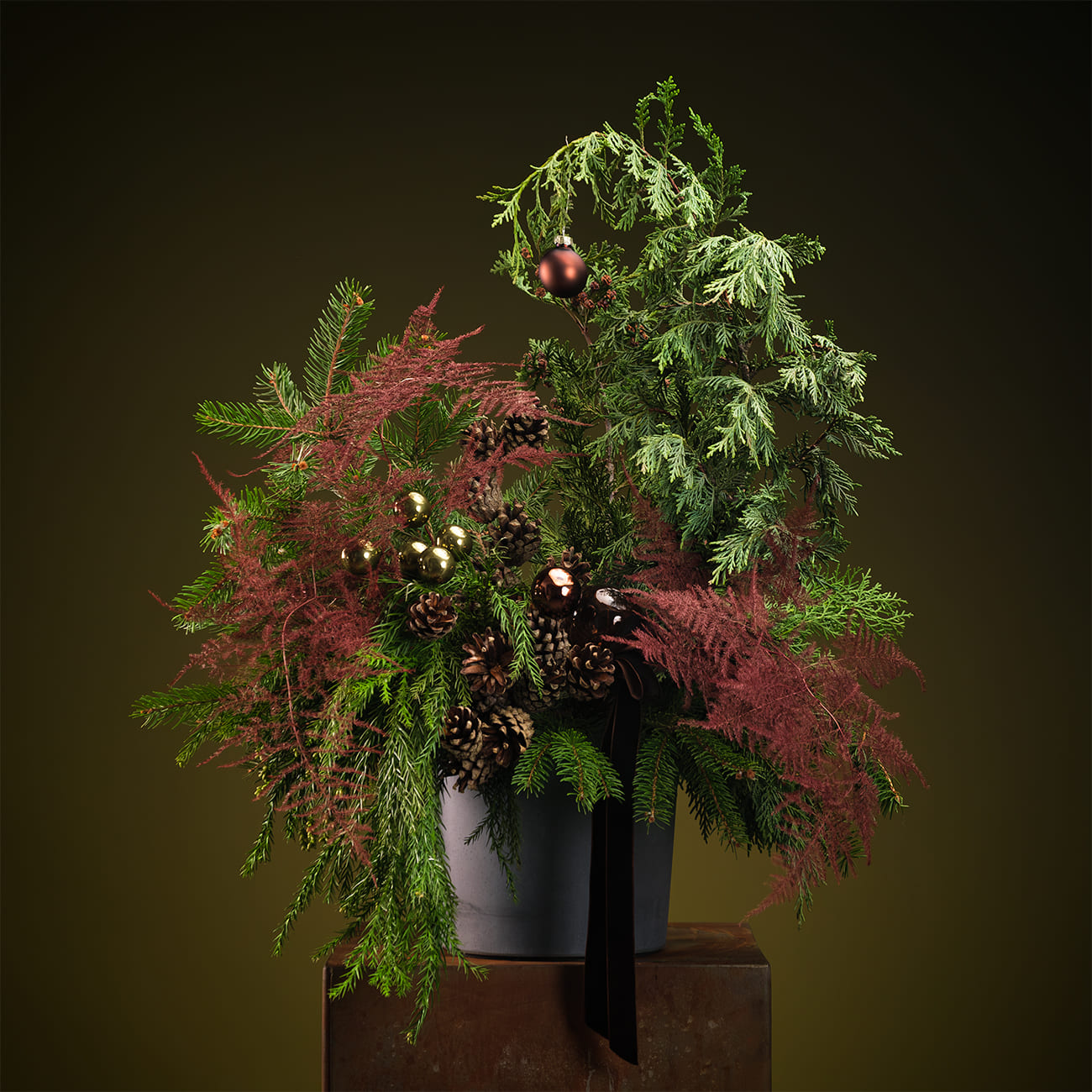 Композиции созданы из живой хвои разных видов, натуральных шишек и веток аспарагуса цвета марсала. Декорированы стеклянными шарами коричневых, зеленых оттенков и фигуркой лошадки.