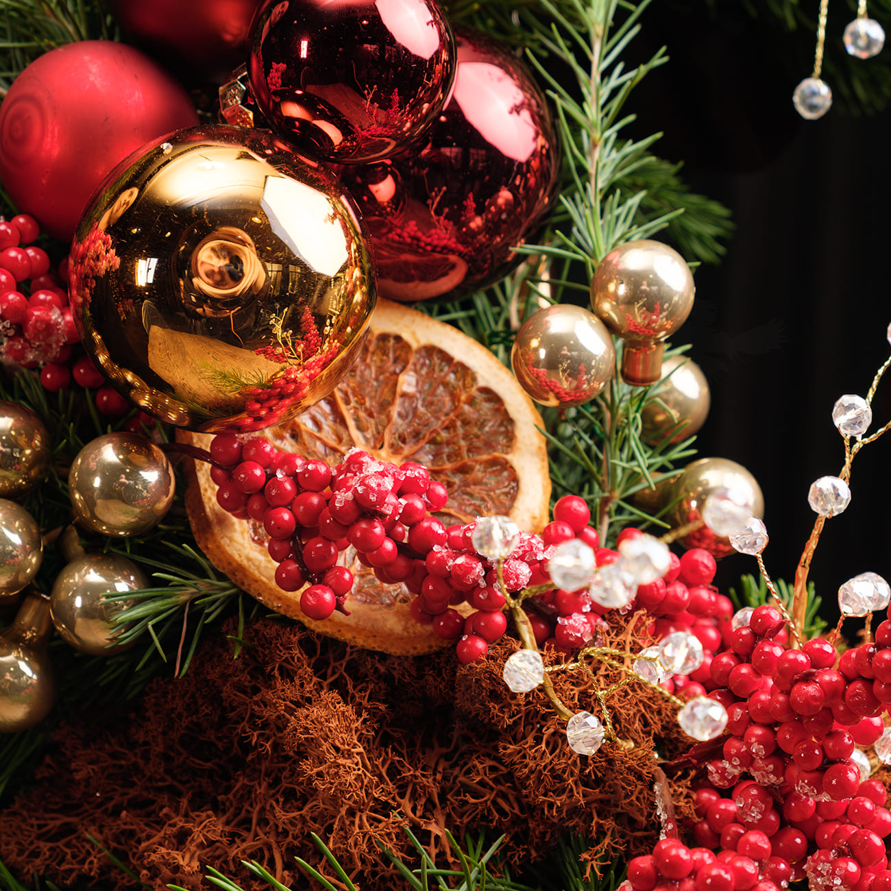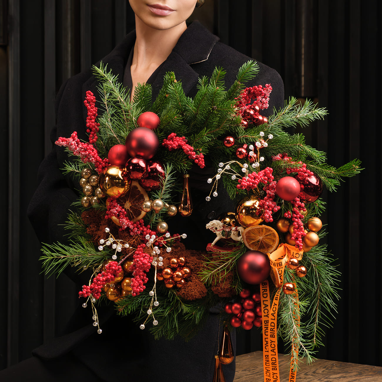 Погрузитесь в атмосферу праздника с нашим венком из коллекции «Пряности и сладости». Он создан из живой хвои разных видов, украшен стеклянными игрушками в теплых оттенках красного, терракотового и дополнен ветками с кристаллами и алыми ягодами.