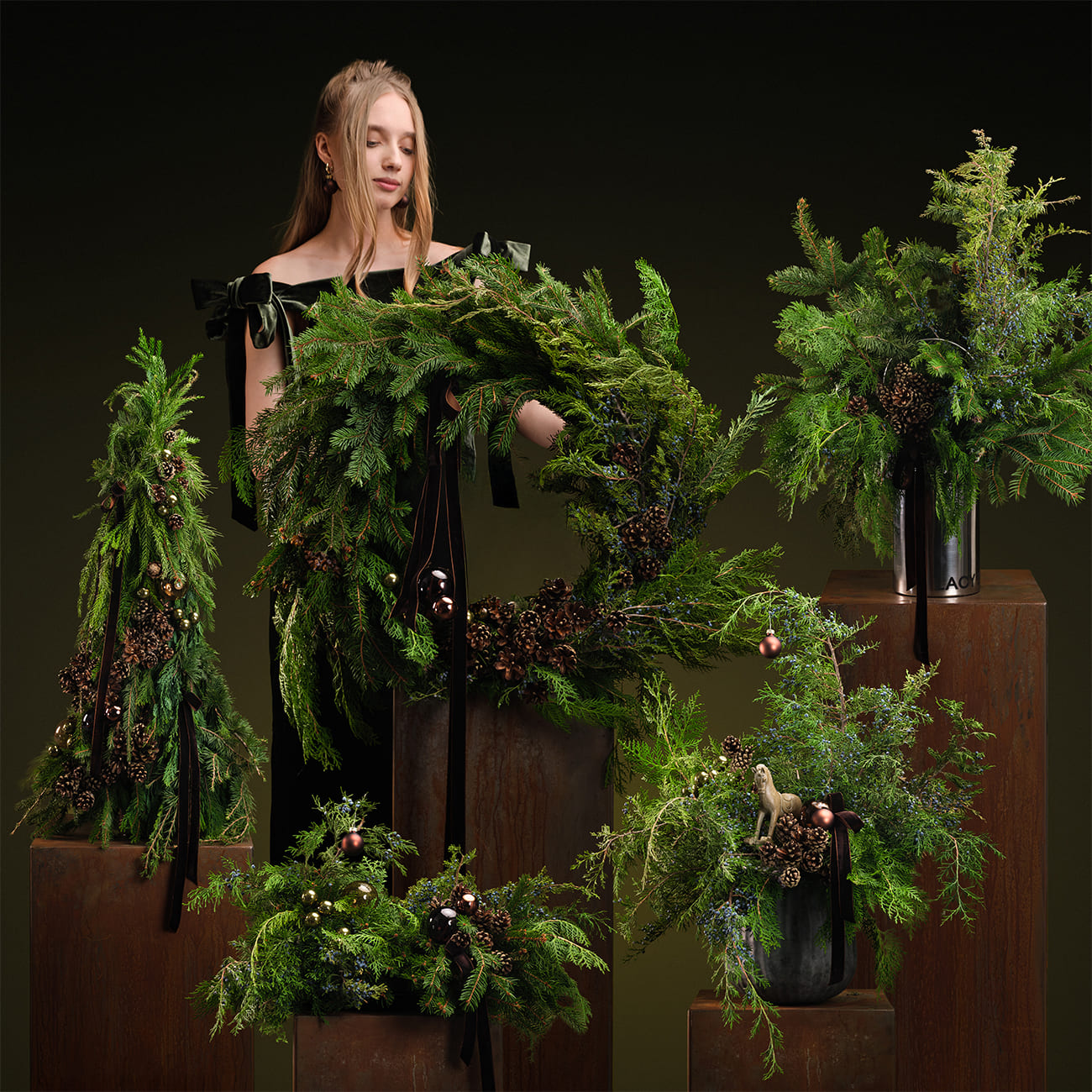 Состав: Елка L, композиция настольная, венок L, бидон M, композиция.