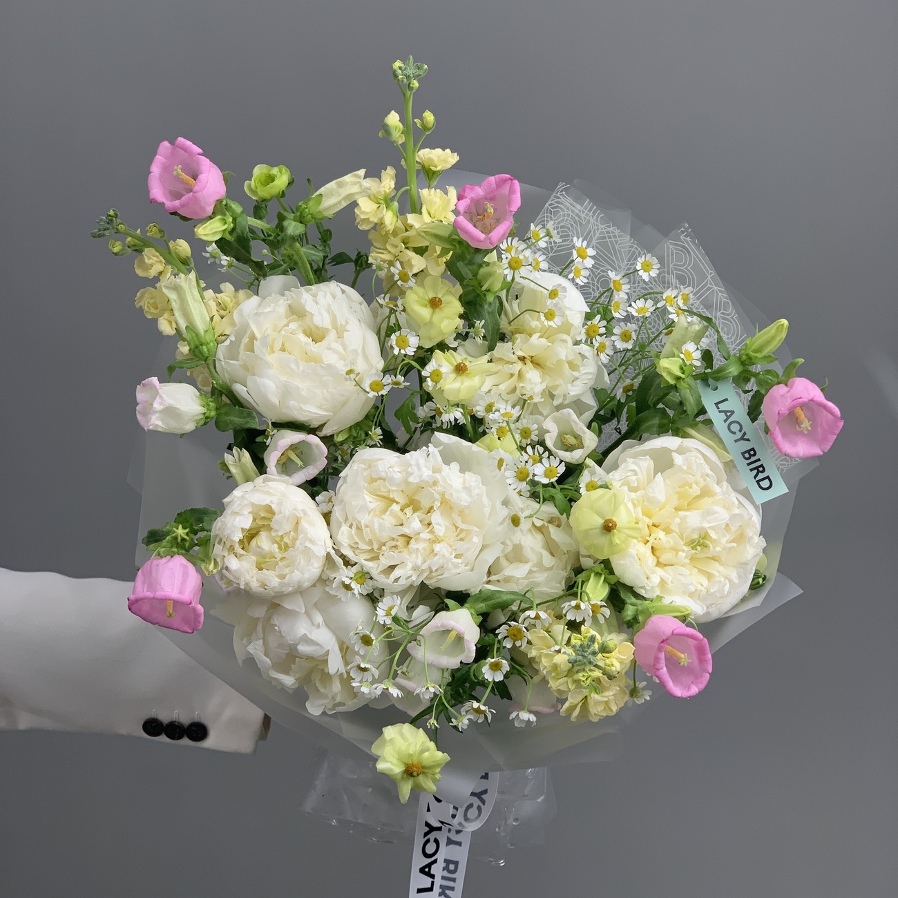 The fresh flowers from Lacy Bird are delivered in original packaging. Remove the packaging and place the flowers in a vase. We recommend not cutting the ribbon tying the flowers to keep the shape of the bouquet.