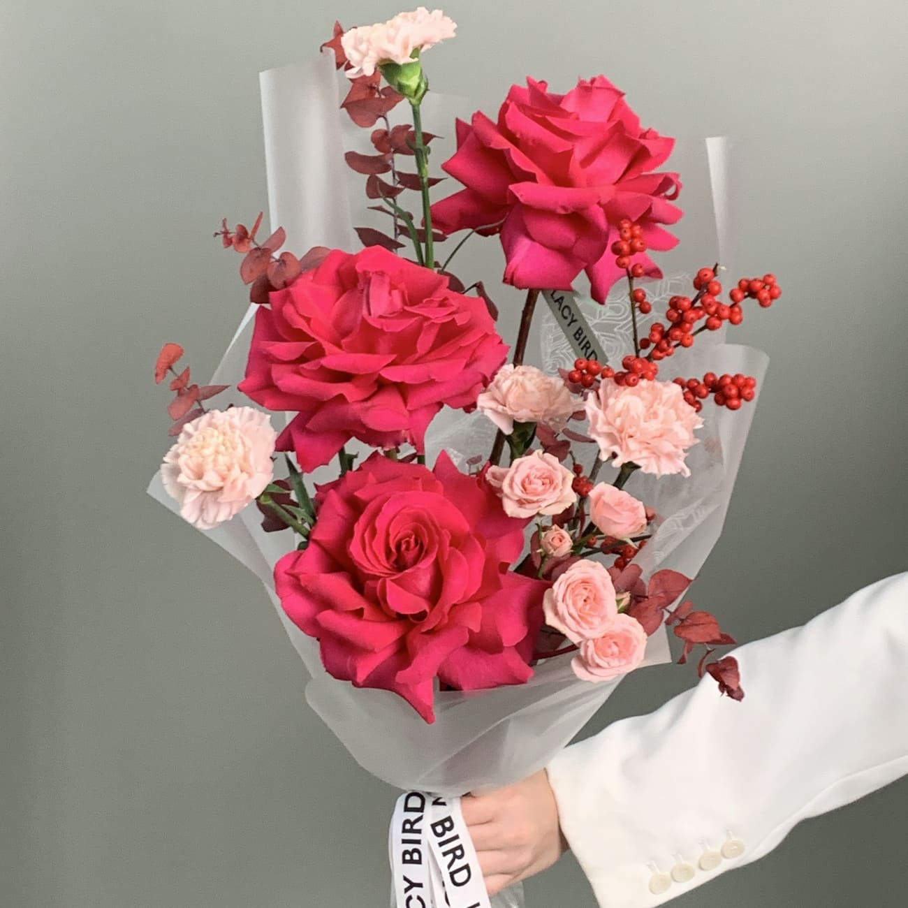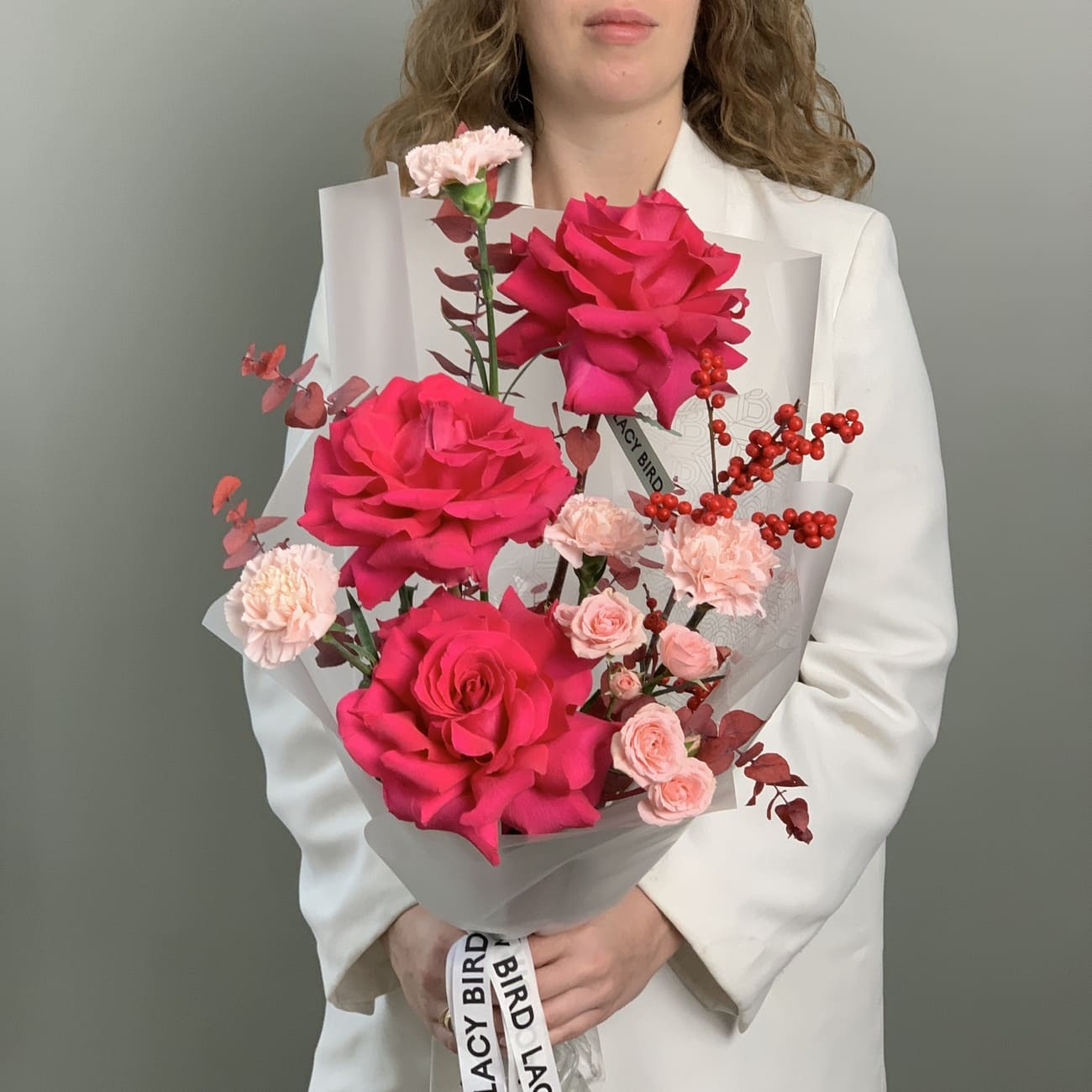 The fresh flowers from Lacy Bird are delivered in original packaging. Remove the packaging and place the flowers in a vase. We recommend not cutting the ribbon tying the flowers to keep the shape of the bouquet.