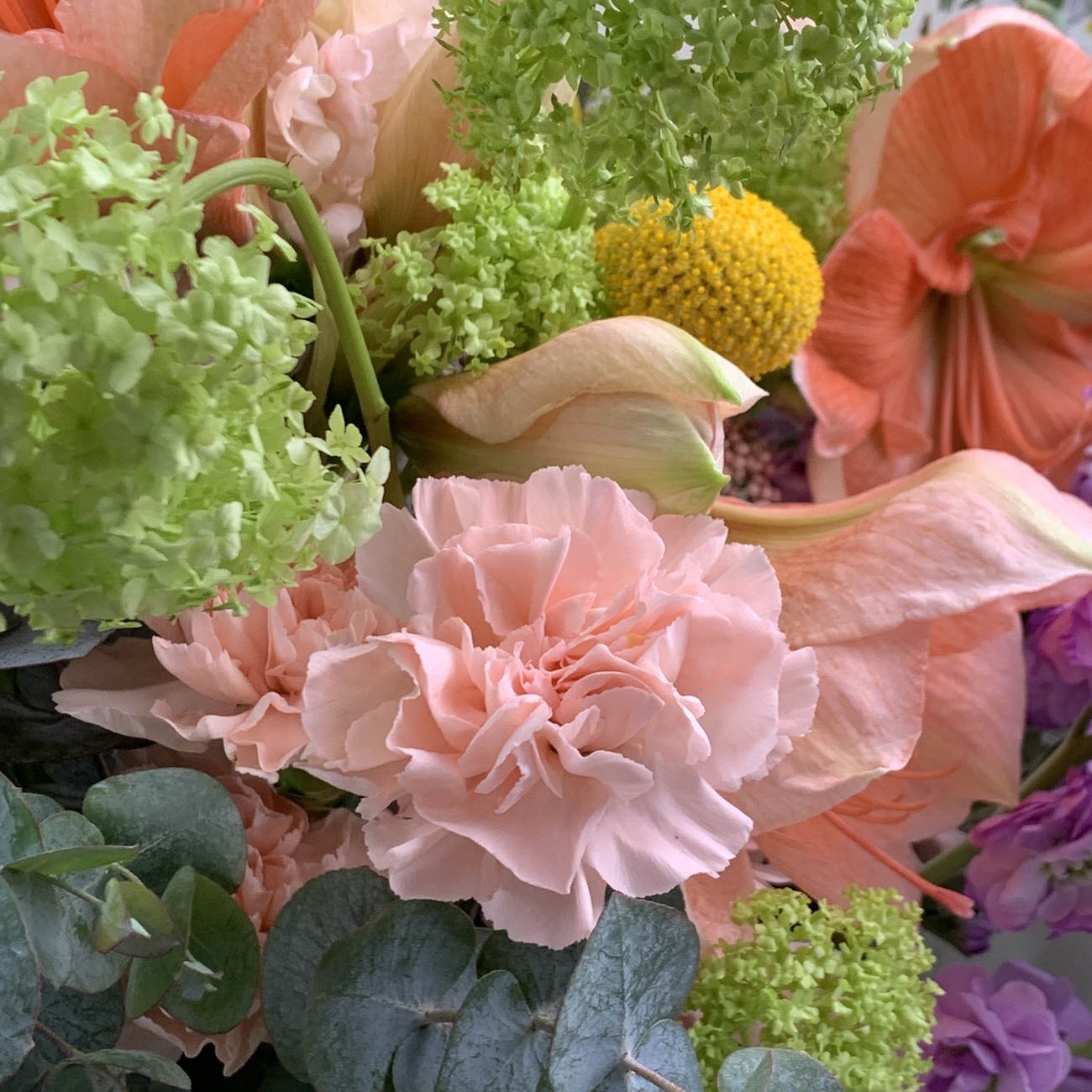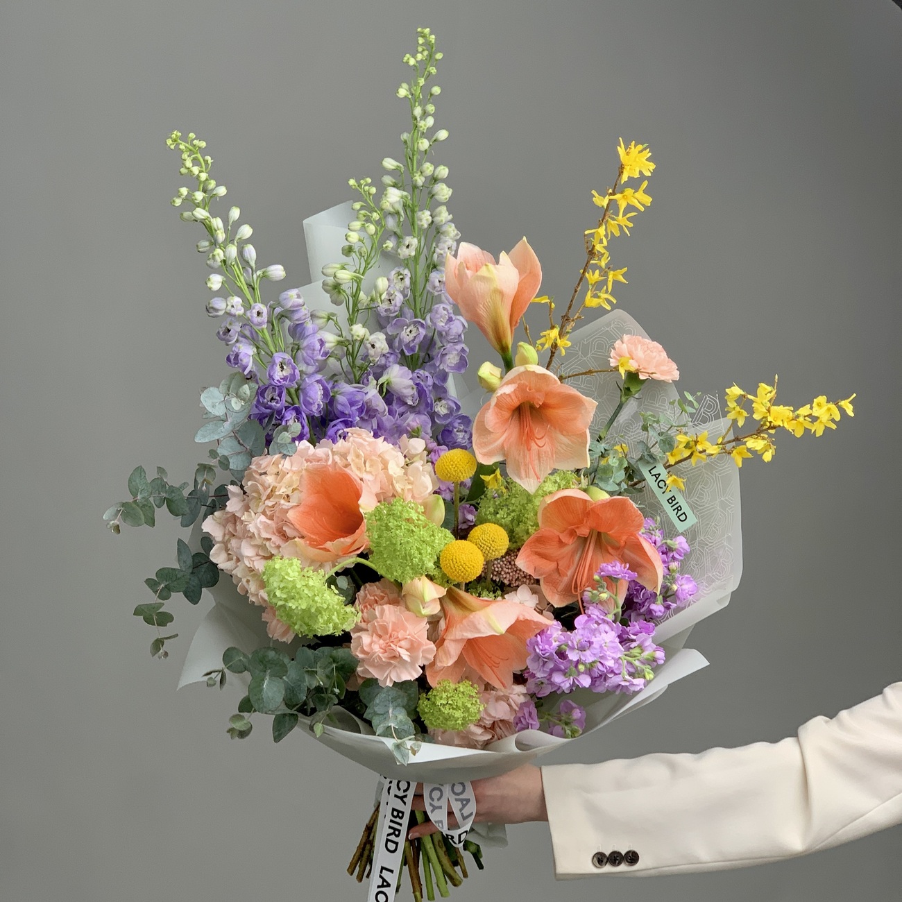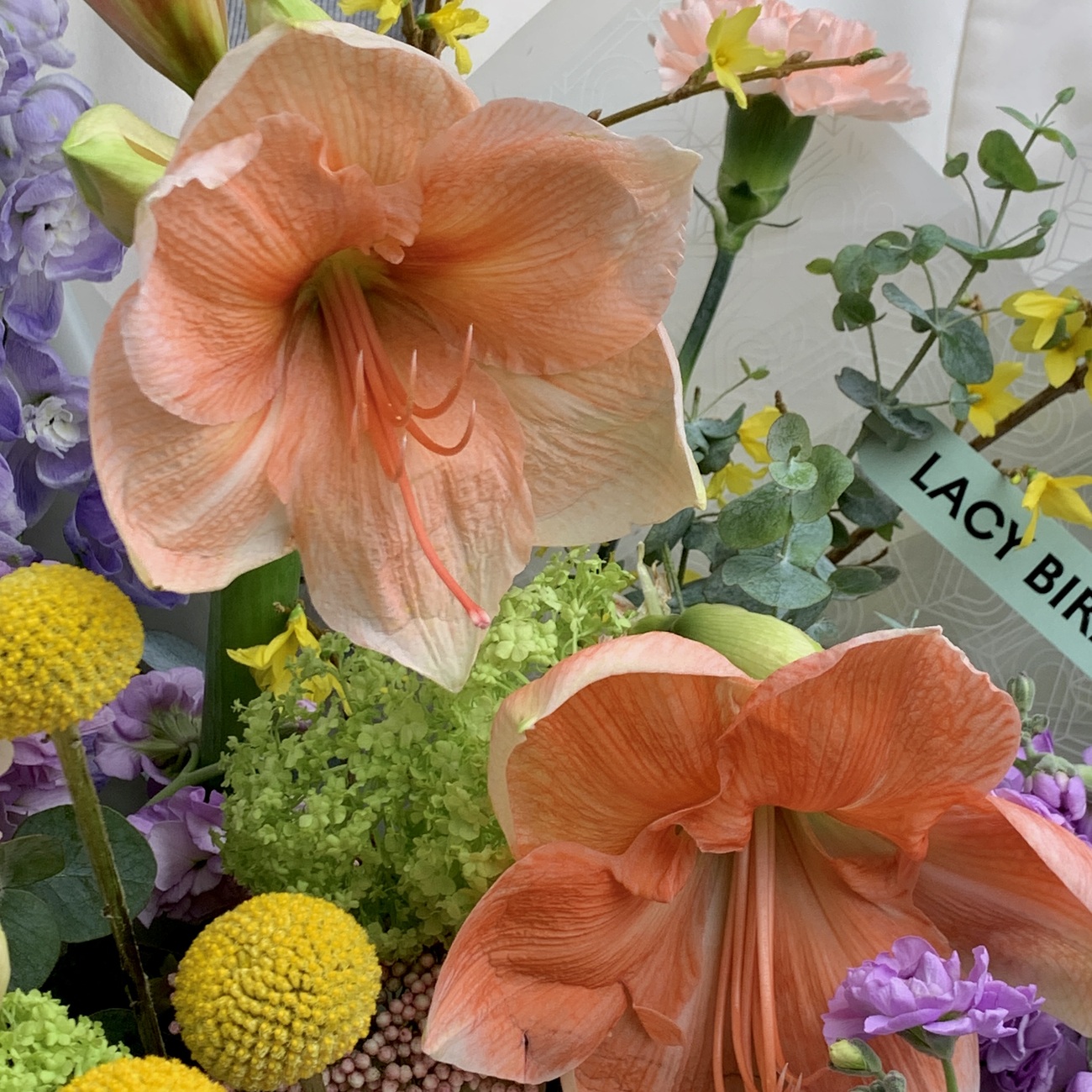 The fresh flowers from Lacy Bird are delivered in original packaging. Remove the packaging and place the flowers in a vase. We recommend not cutting the ribbon tying the flowers to keep the shape of the bouquet.