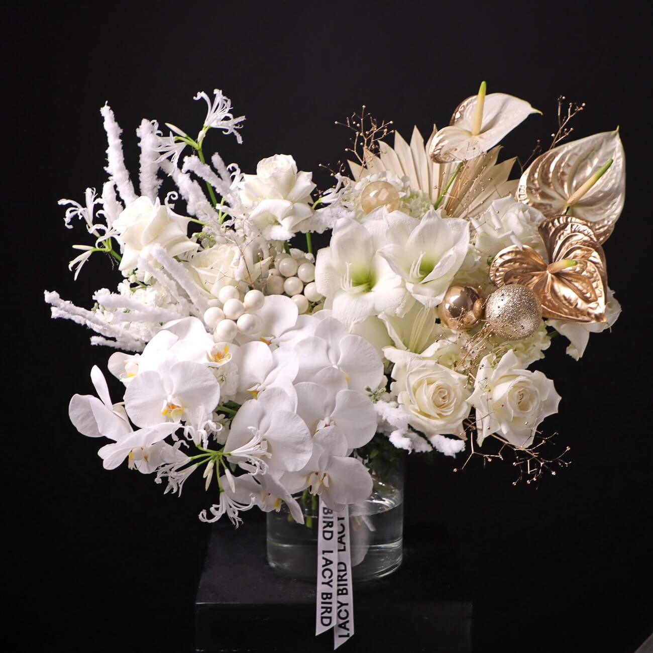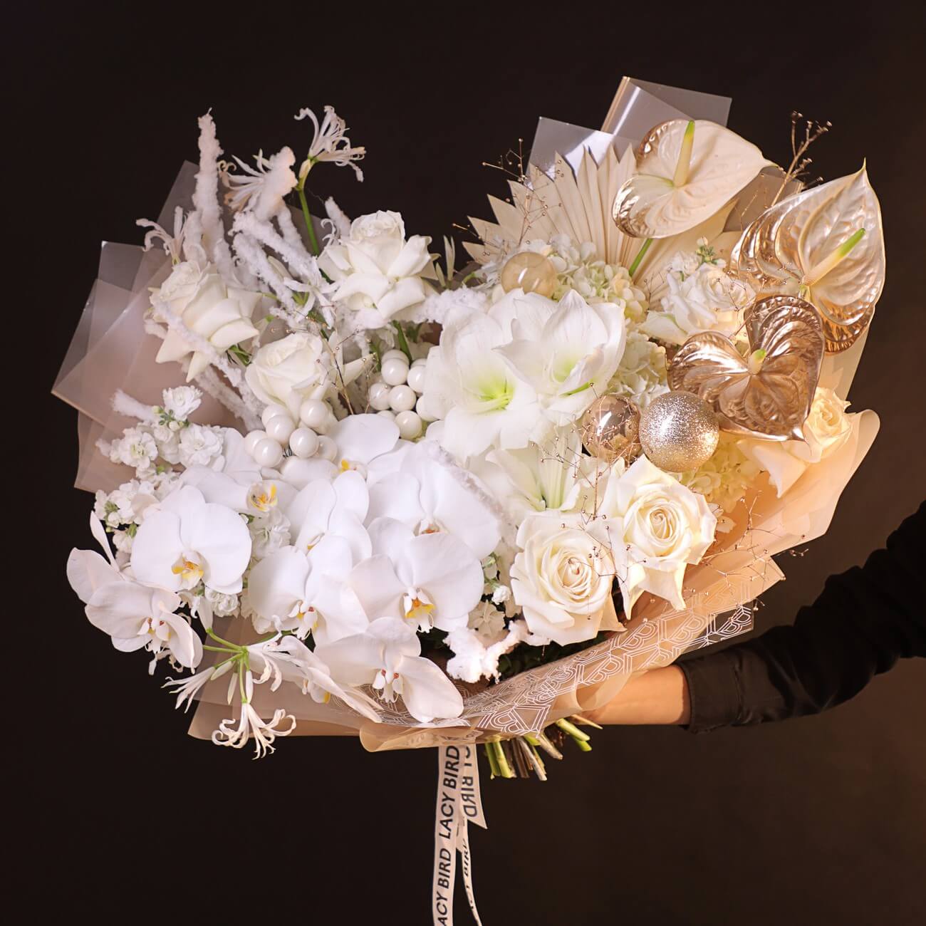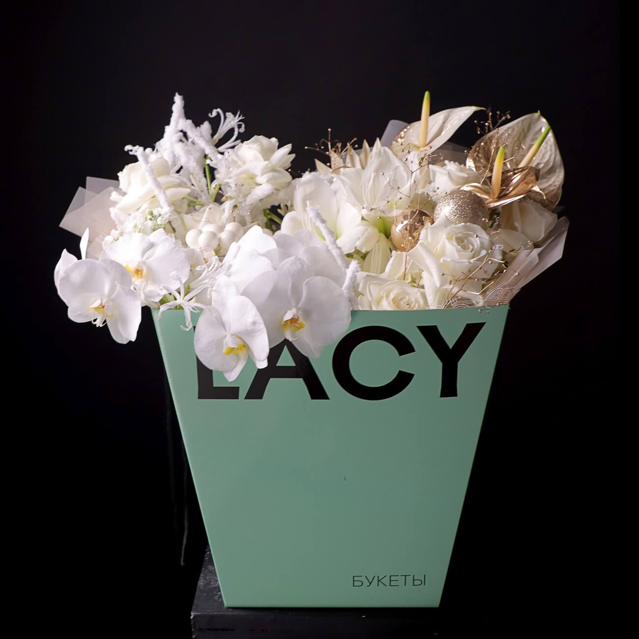 Свежие цветы от Lacy Bird доставляются в фирменной упаковке, которую необходимо снять при установке в вазу. Не срезайте ленту, связывающую букет для сохранения формы.