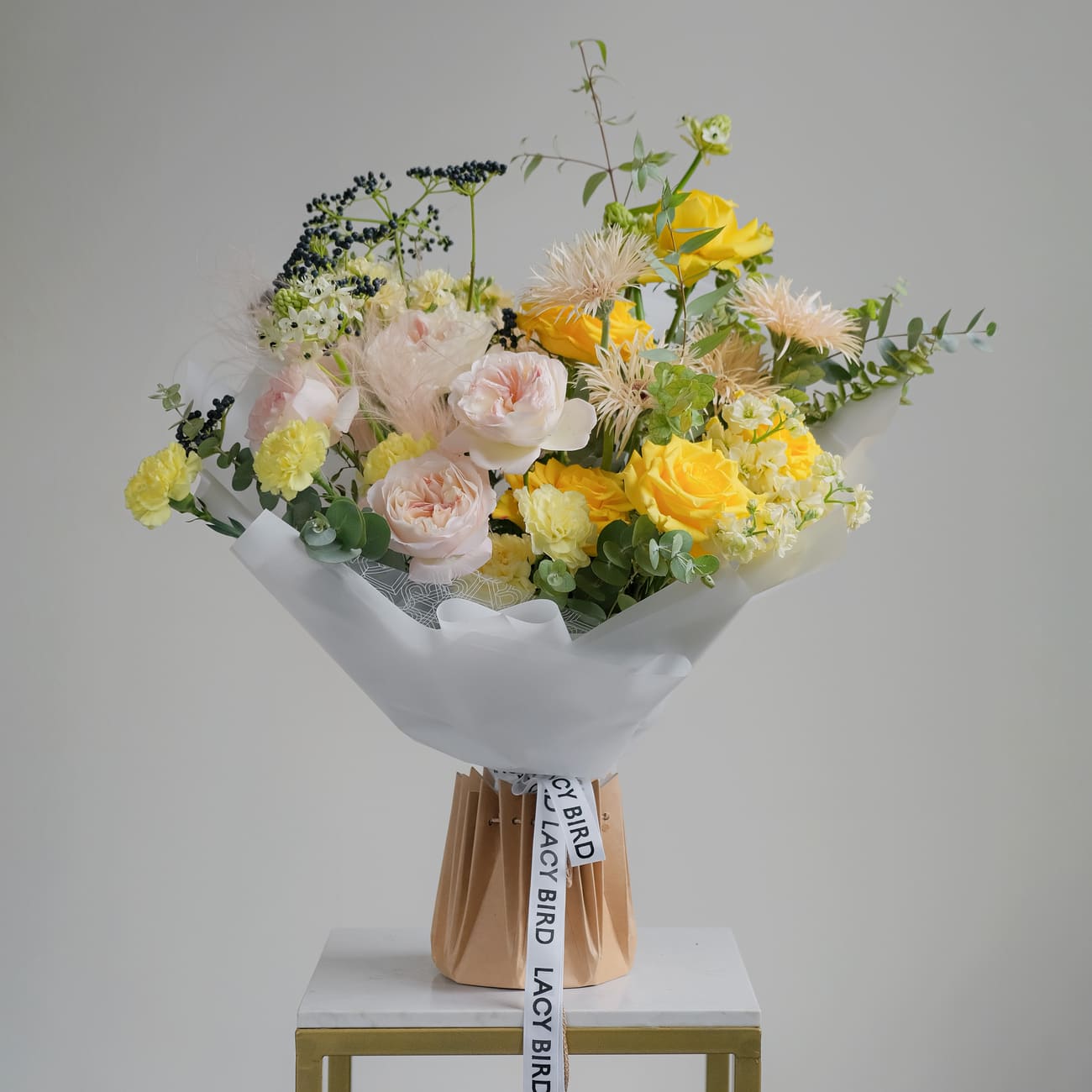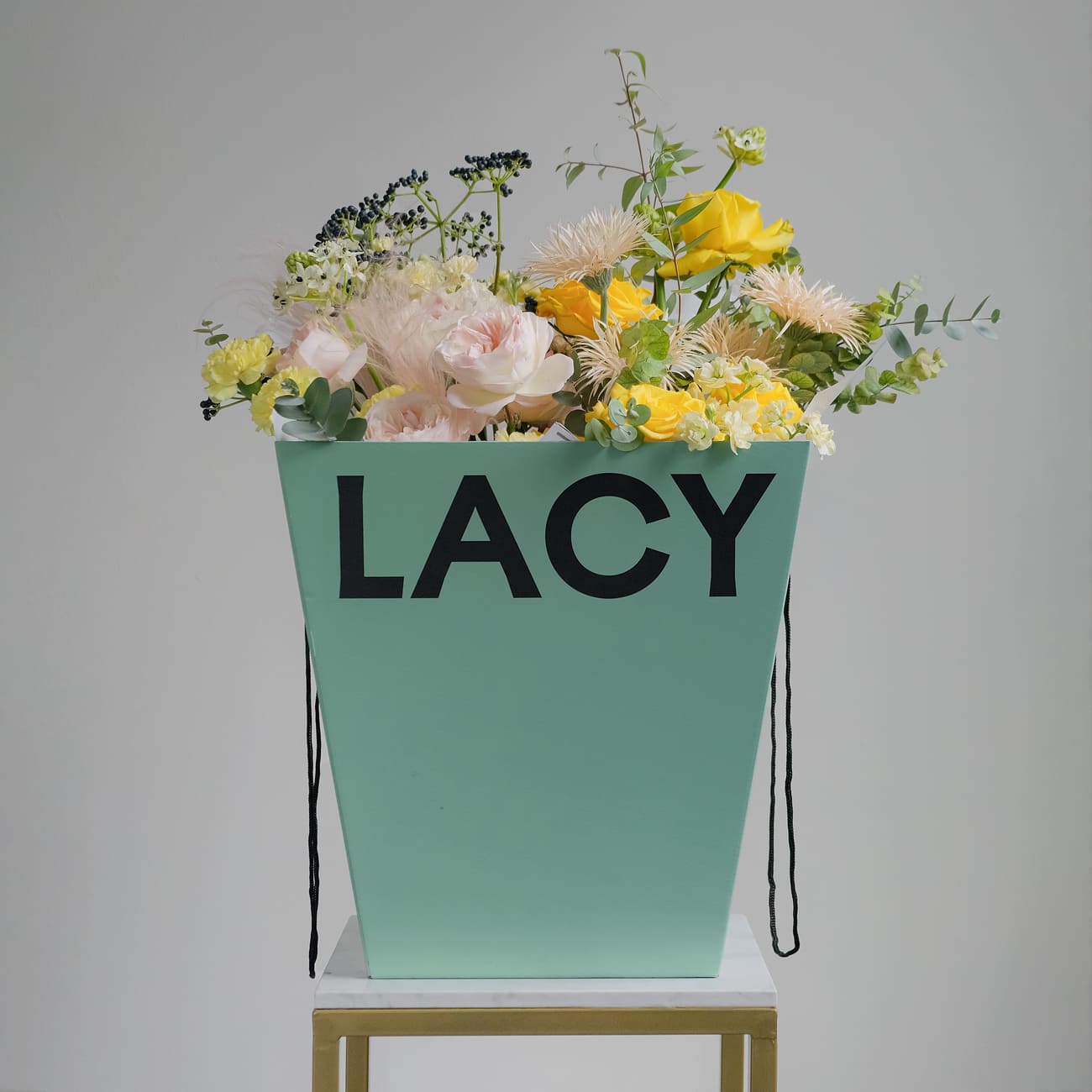 Свежие цветы от Lacy Bird доставляются в фирменной упаковке, которую необходимо снять при установке в вазу. Не срезайте ленту, связывающую букет для сохранения формы.