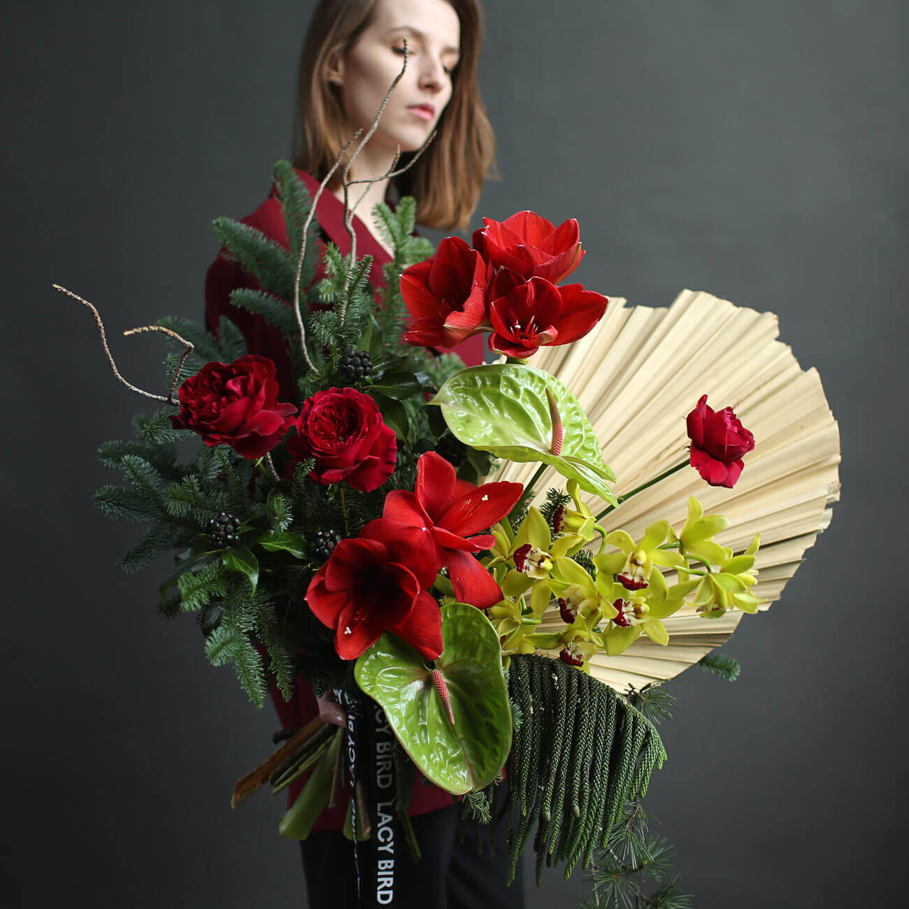 Свежие цветы от Lacy Bird доставляются в фирменной упаковке, которую необходимо снять при установке в вазу. Не срезайте ленту, связывающую букет для сохранения формы.