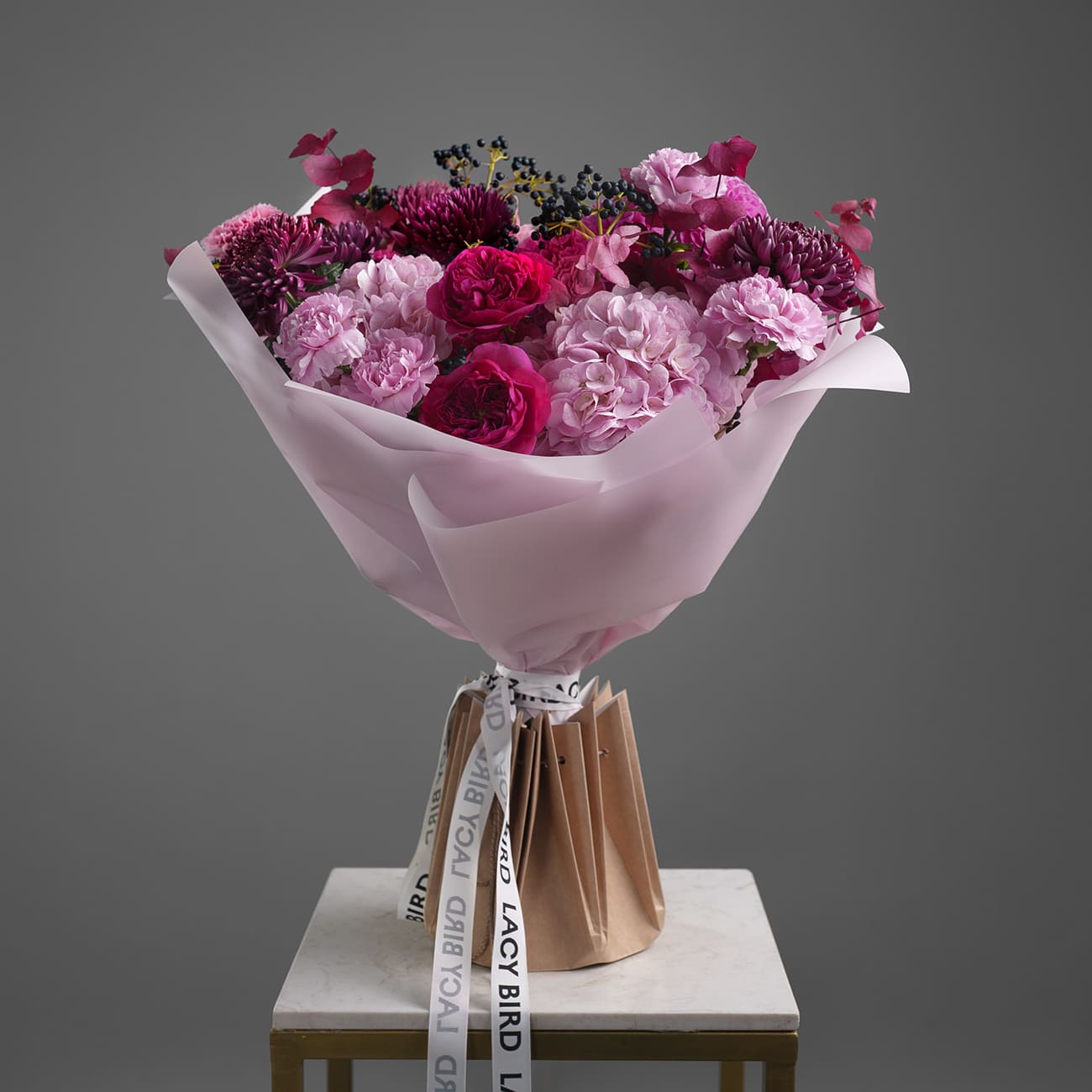 Изысканное сочетание глубоких малиновых тонов и насыщенного розового делает эту композицию одновременно выразительной и элегантной. Этот букет создан, чтобы удивлять, радовать и дарить ощущение легкости и праздника.