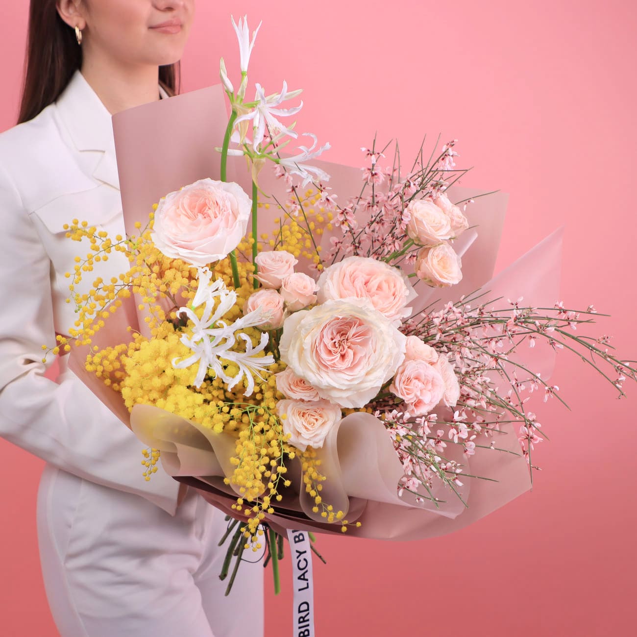 Свежие цветы от Lacy Bird доставляются в фирменной упаковке, которую необходимо снять при установке в вазу. Не срезайте ленту, связывающую букет для сохранения формы.