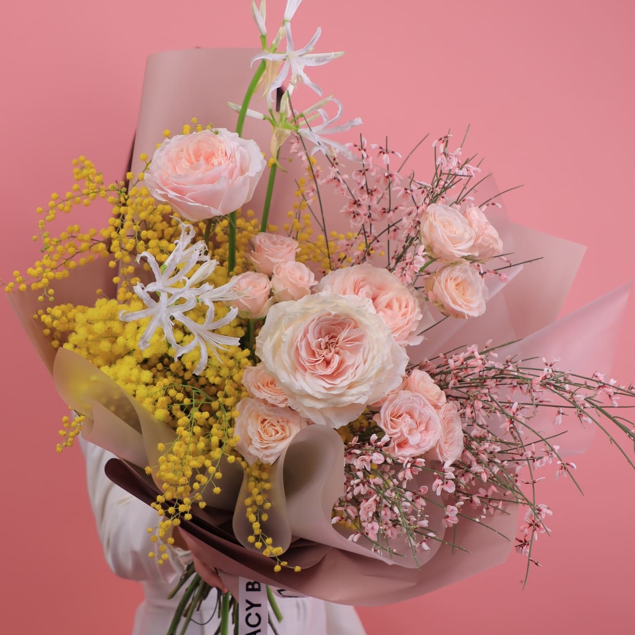 Букет «Мелодия солнца» — это симфония ярких оттенков, олицетворяющая весеннее тепло и свежесть. Нежные персиковые розы нежно обнимаются с солнечными желтыми шариками мимозы, создавая атмосферу легкости и радости. Белоснежные акценты хрупких нерине добавляют изящество, подчеркивая утонченность композиции.