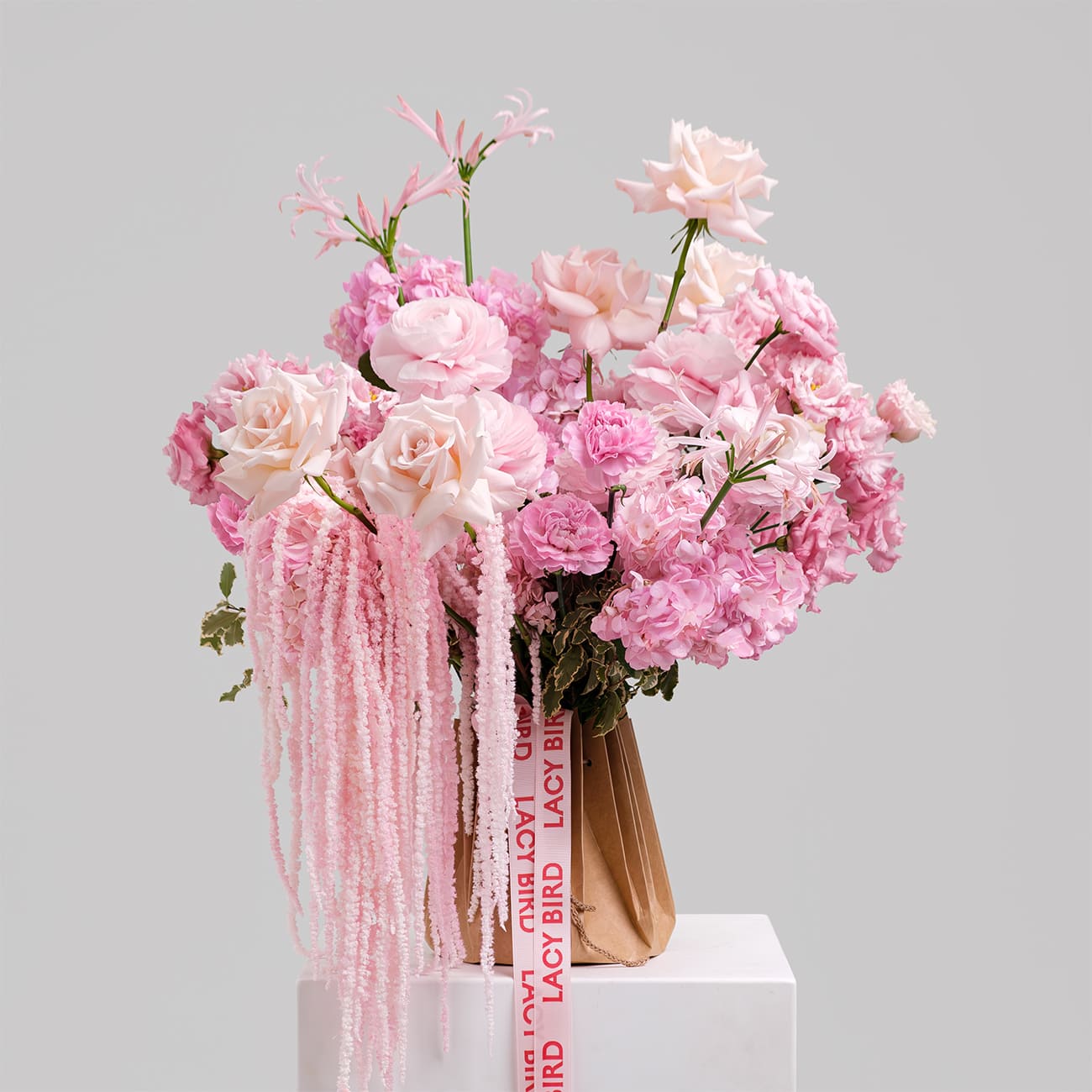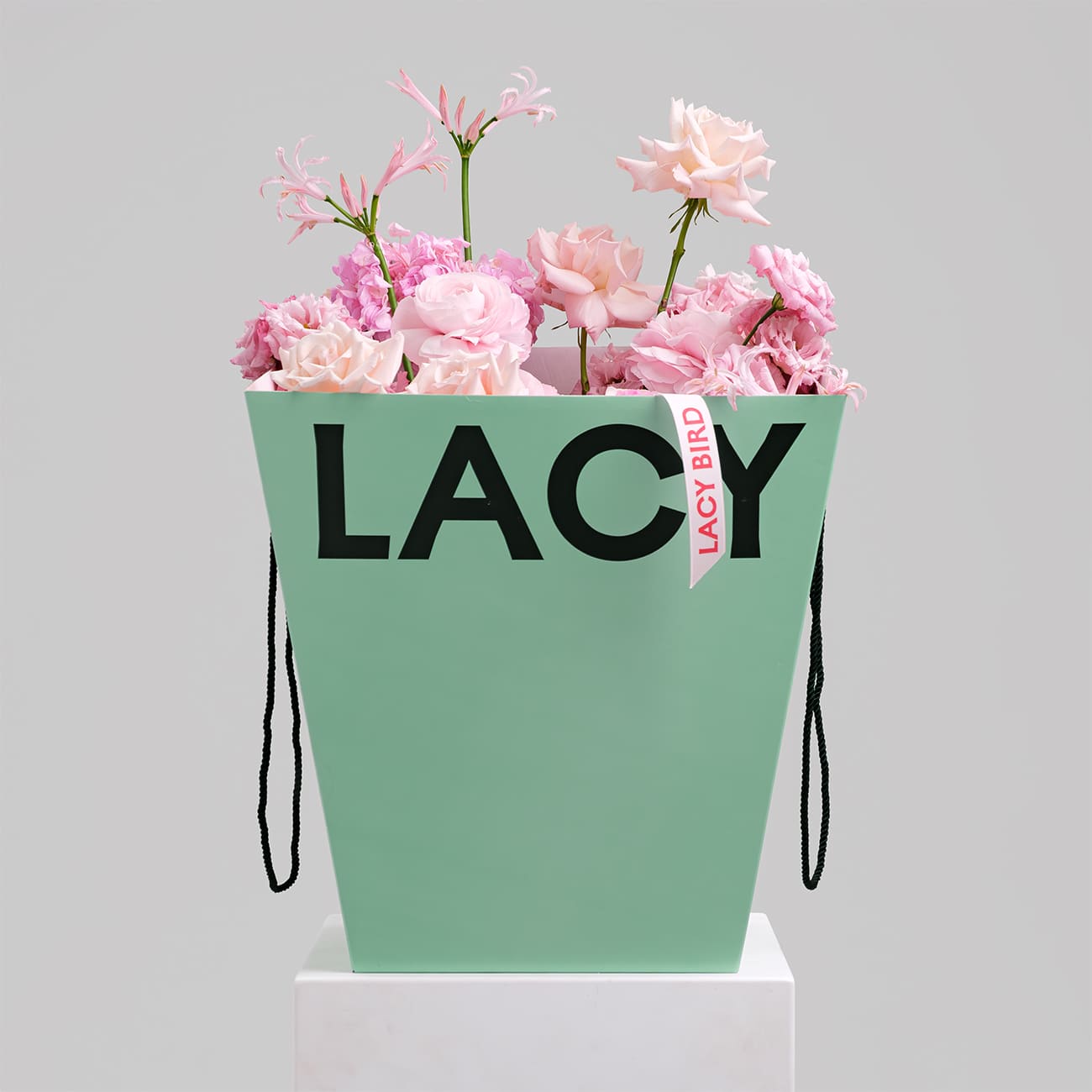 Свежие цветы от Lacy Bird доставляются в фирменной упаковке, которую необходимо снять при установке в вазу. Не срезайте ленту, связывающую букет для сохранения формы.