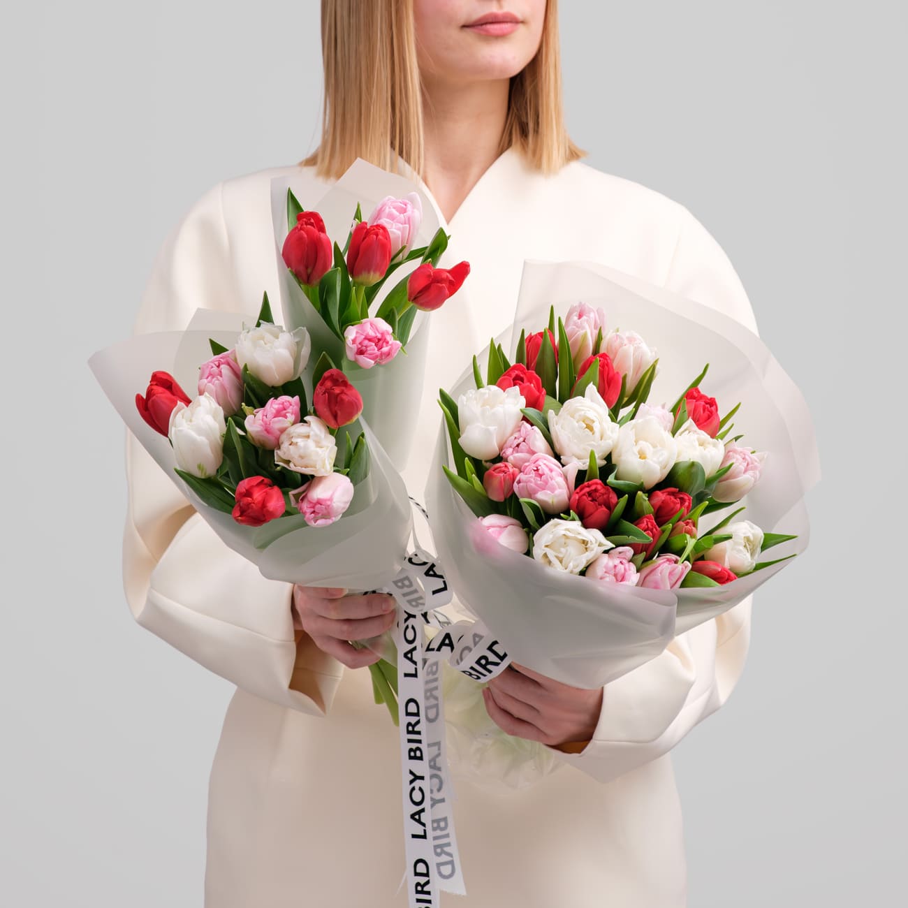 Свежие цветы от Lacy Bird доставляются в фирменной упаковке, которую необходимо снять при установке в вазу. Не срезайте ленту, связывающую букет для сохранения формы.