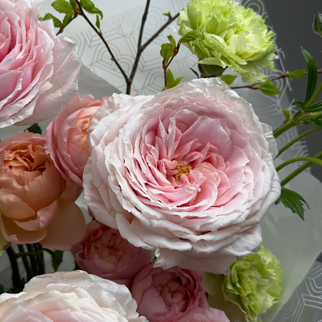 Почувствуйте гармонию фактур и оттенков в авторском букете, где нежная роза Тсумуги встречается с воздушным ранункулюсом Батерфляй, кустовой розой Джульетта и изящной гвоздикой. Ветки берёзы добавляют композиции природную лёгкость и графичность, создавая ощущение живого весеннего движения. Букет выглядит современно, утончённо и по-настоящему атмосферно.