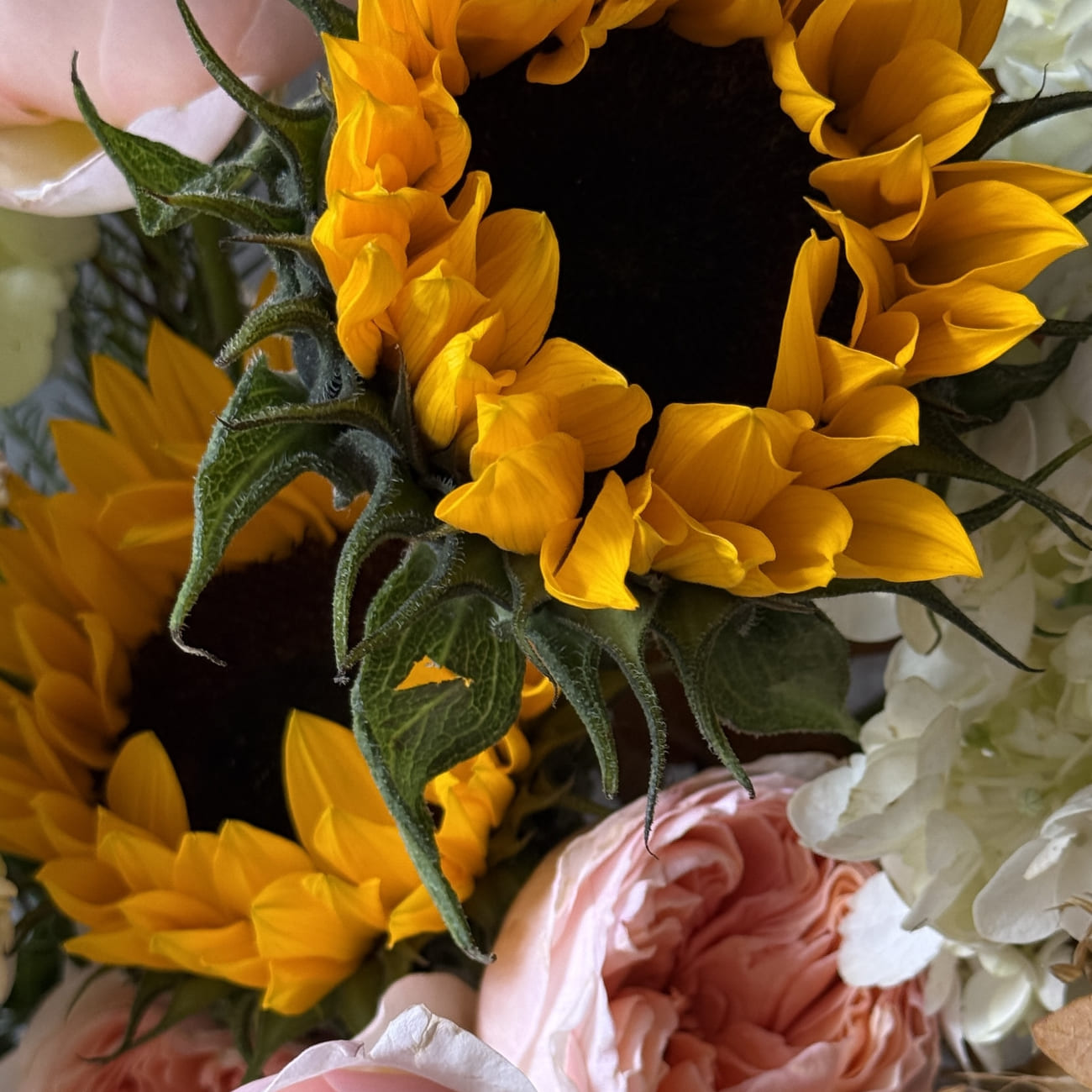 Откройте двери в мир осенней красоты с букетом "Золотая осень". Яркие подсолнухи, обрамлённые персиковыми розами и белыми гортензиями, дарят солнечное настроение. Золотистые листья и сухие веточки завершают композицию, привнося уют и тепло.