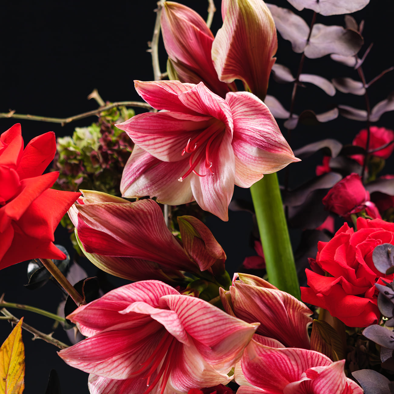 Погрузитесь в атмосферу мистики и волшебства с нашим букетом "Тайны Хэллоуина". Яркие красные розы, изящные амариллисы и загадочный амарант, чувственный контраст с насыщенной зеленью, оживляют праздник тайн и магии.