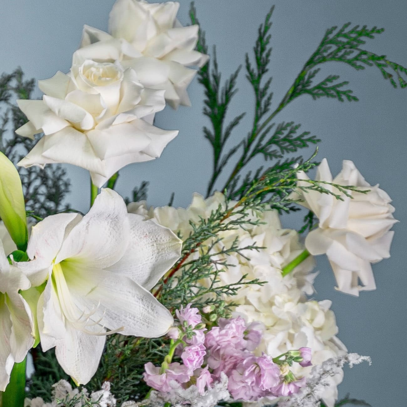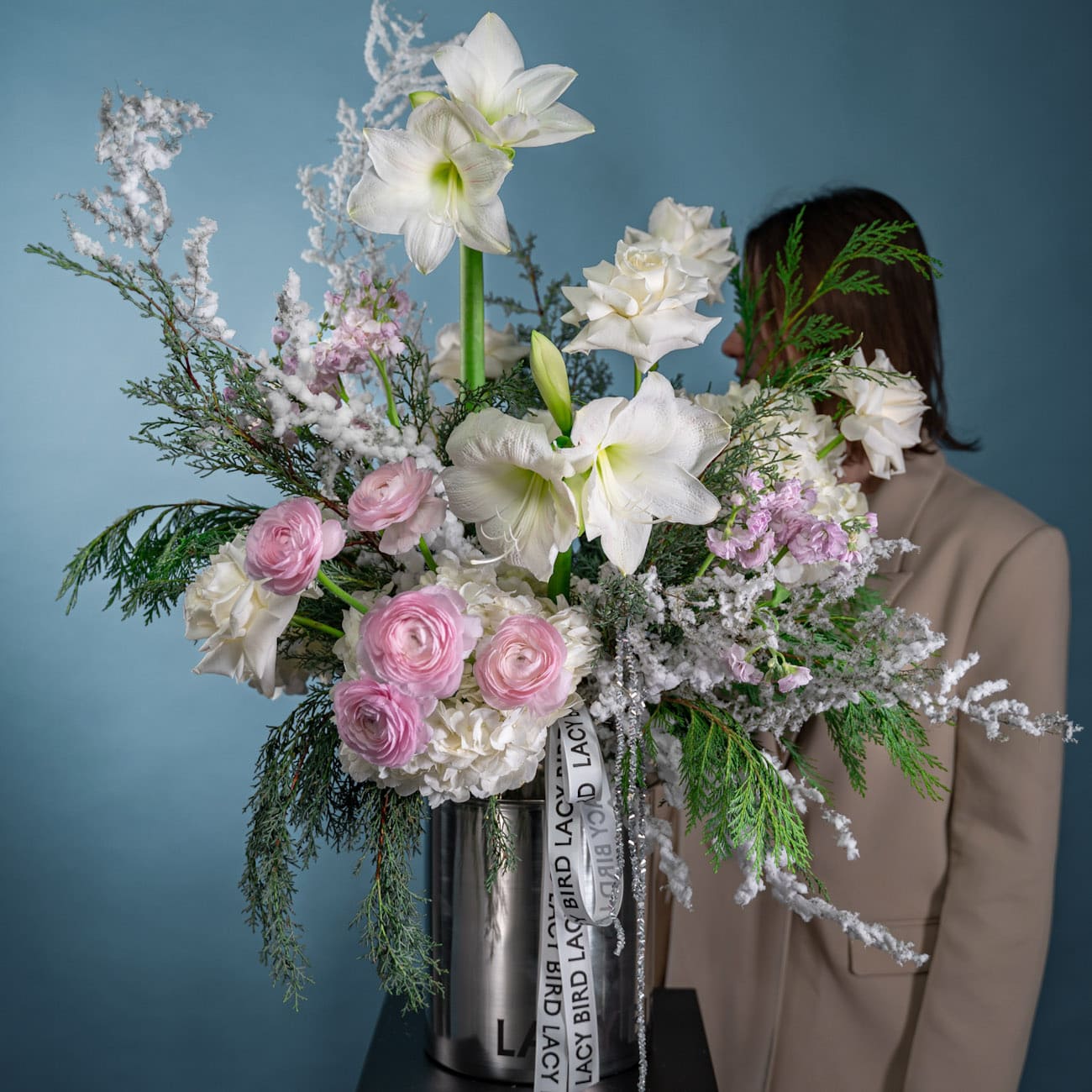 Познакомьтесь с нашим изысканным букетом, собранным в стильном бидоне, который играет роль вазы. В композиции гармонично сочетаются роскошные амариллисы и гортензии, придающие букету воздушность и элегантность. Ароматная маттиола добавляет нотки нежности, а розы и ранункулюсы дарят романтическое очарование. Завершает композицию зелень хвои и заснеженные ветки, создавая ощущение свежести и уюта.