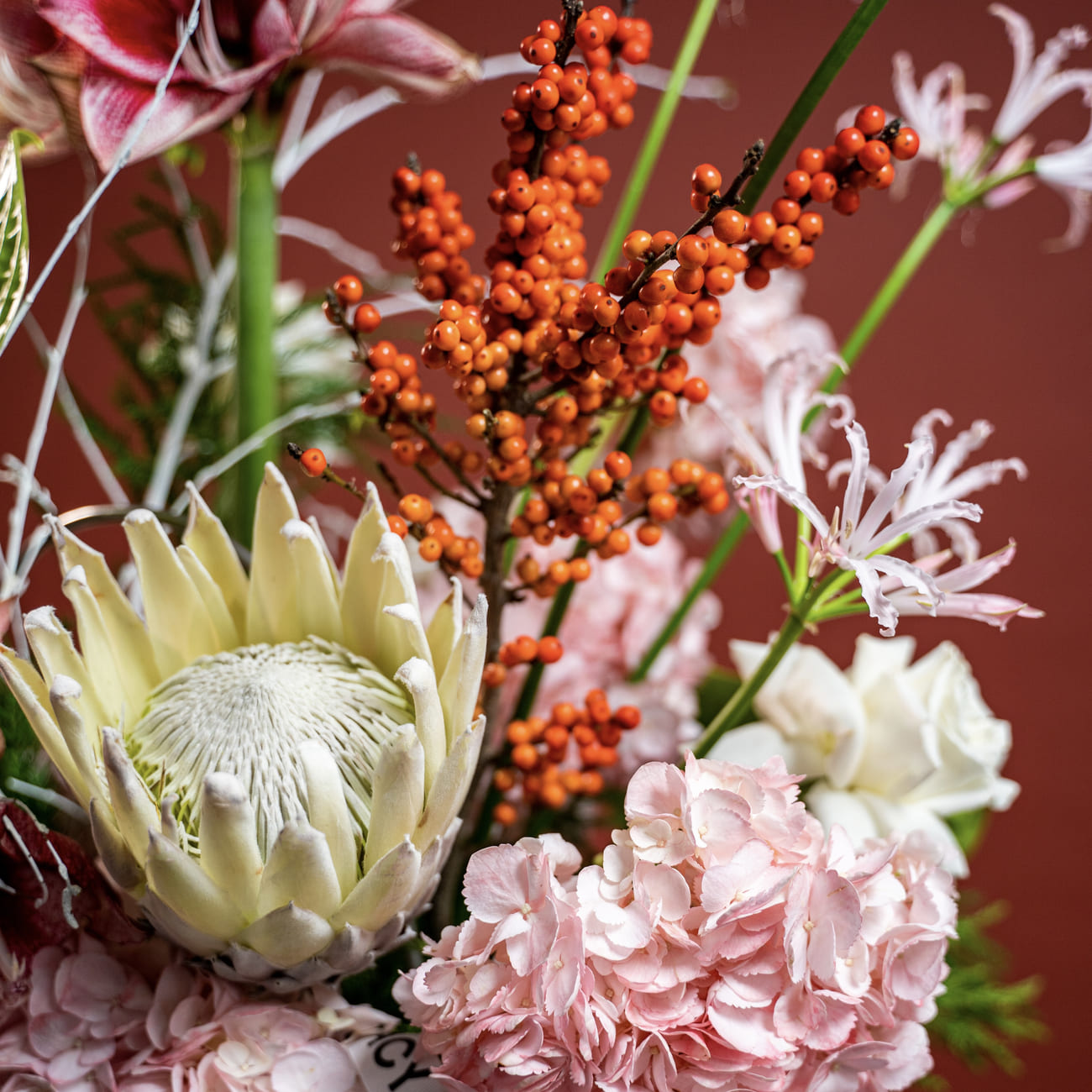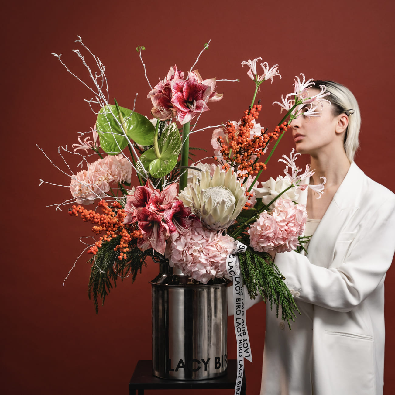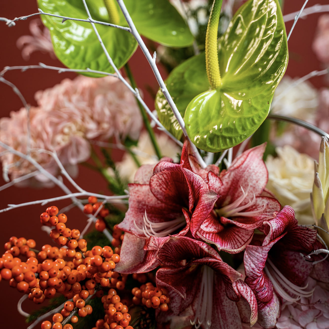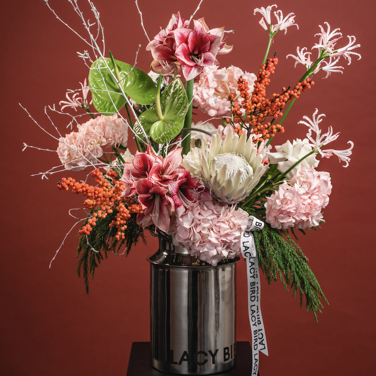 Погрузитесь в мир утонченной красоты с нашим эксклюзивным букетом в бидоне. Эта изысканная композиция сочетает в себе яркость амариллисов и нежность розы, а также экзотичность антуриума и протеи. Нежная нерине дарит романтичный штрих. Ветки хвои завершают ансамбль своей зеленью, создавая гармонию и свежесть.
