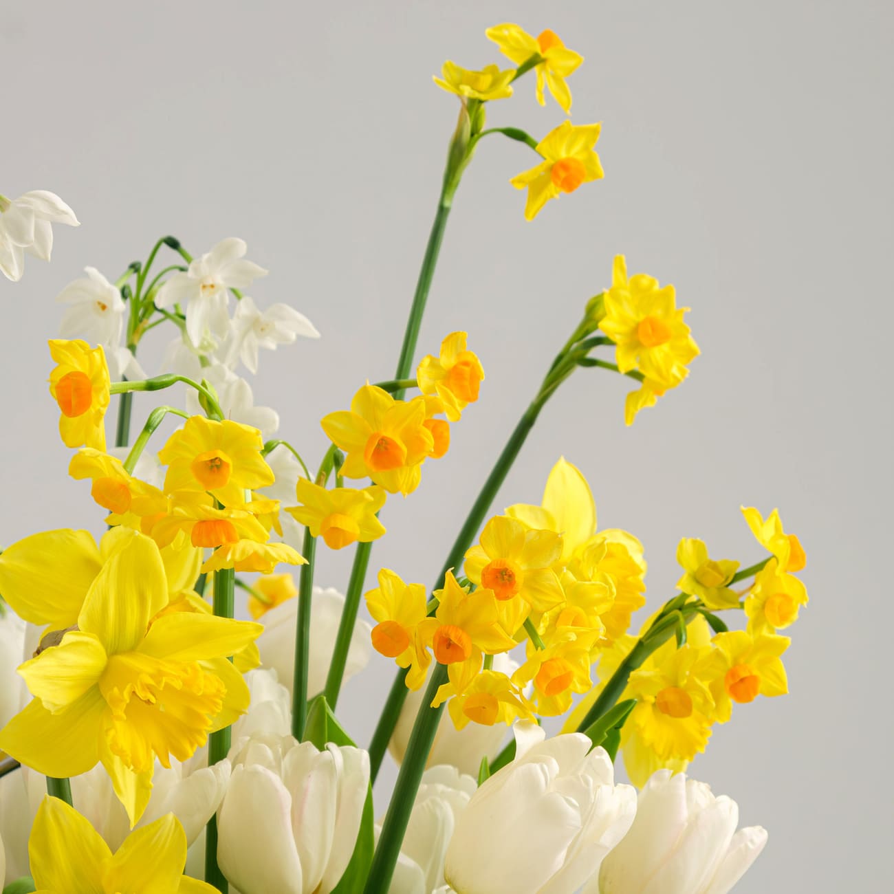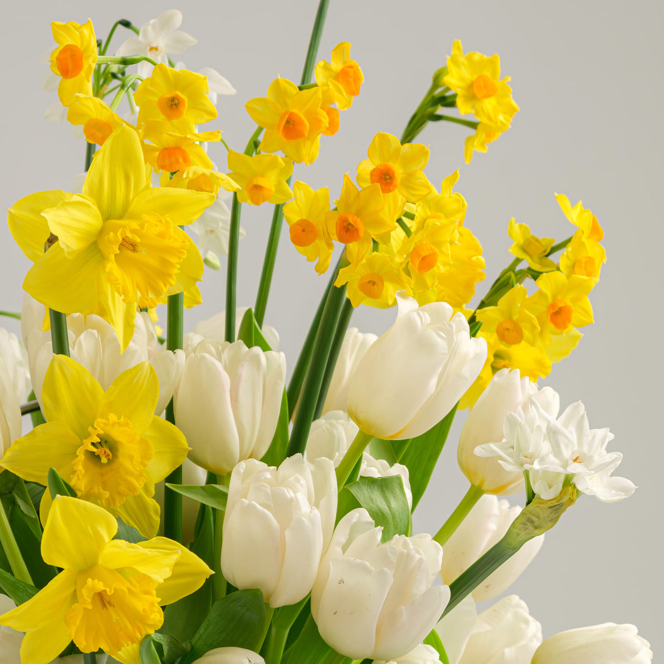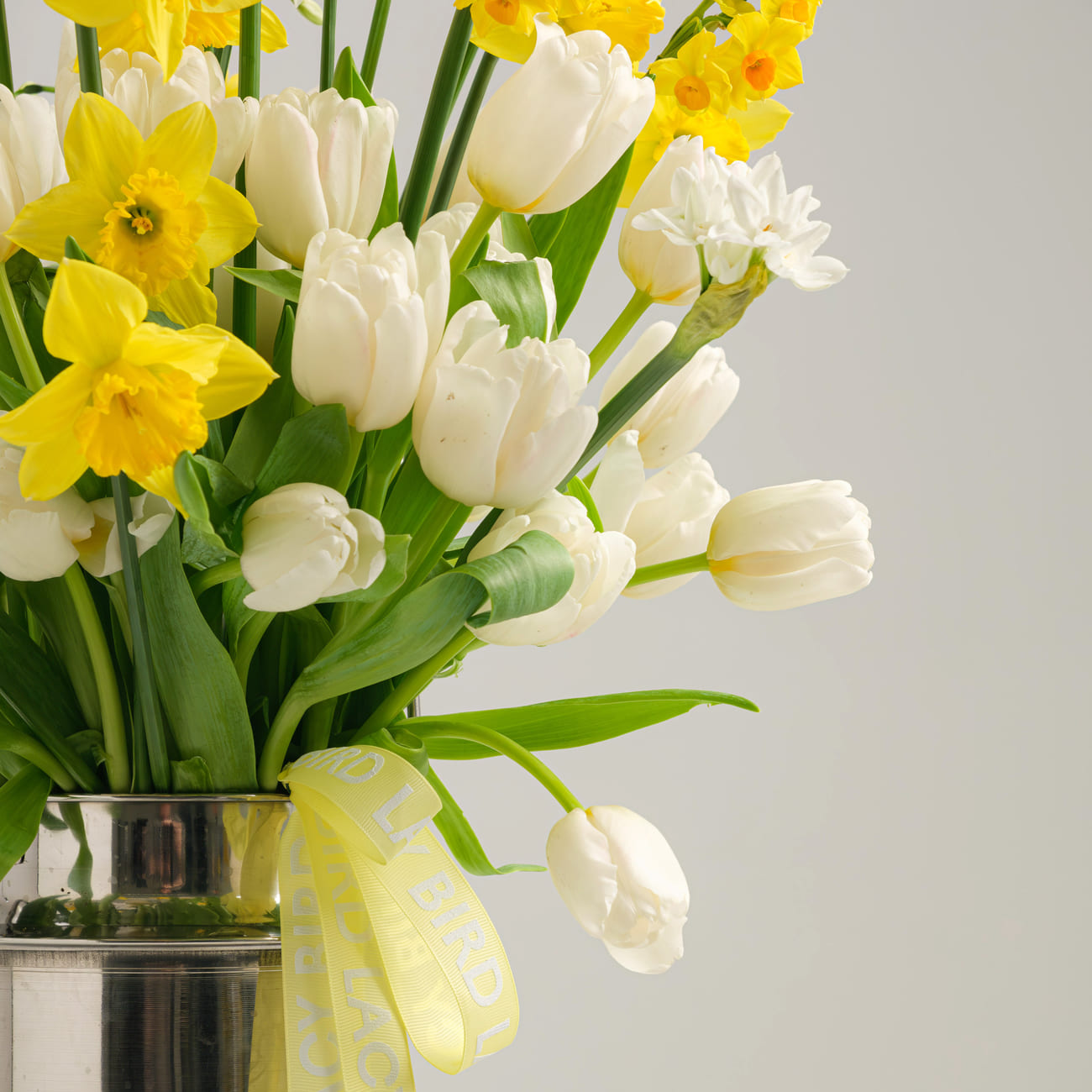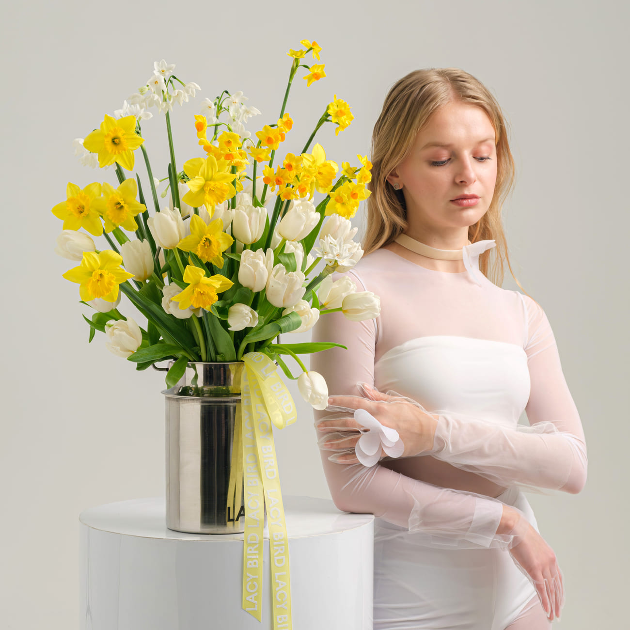 Превратите каждый день в праздник с нашим изысканным дуобукетом из нарциссов и тюльпанов! Яркие жёлтые нарциссы и нежные белые тюльпаны составляют восхитительную композицию, заключённую в стильный металлический бидон от "LACY BIRD". Контрастные цвета цветов создают атмосферу радости и весенней свежести. Идеально подходит для добавления нотки веселья и света в ваш дом или как уникальный подарок для особого случая.