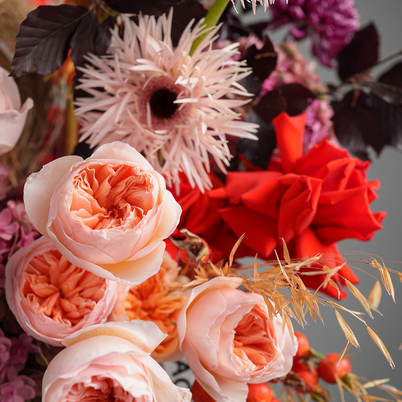 Создайте атмосферу уюта и нежности с букетом "Теплые чувства". Пастельные розы, пурпурные хризантемы и яркие красные акценты создают гармоничную палитру, излучающую любовь и тепло. Осенние листья и сушеные травы добавляют уют, превращая букет в идеальное украшение интерьера.