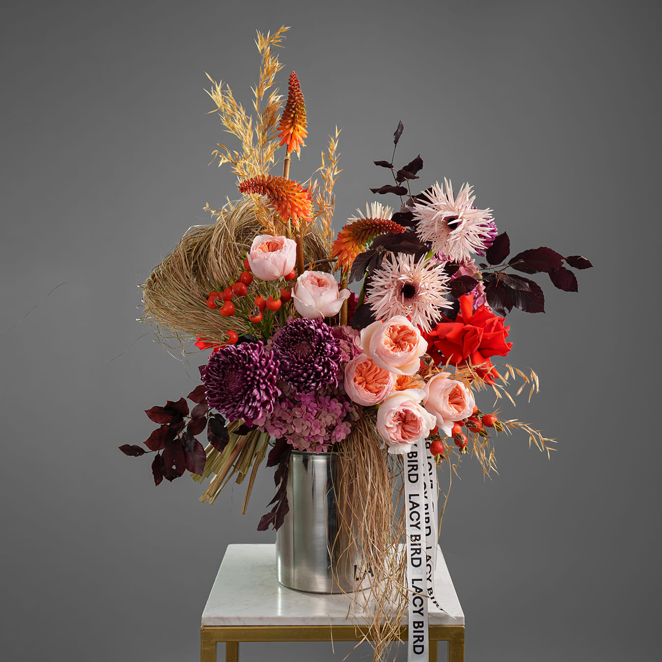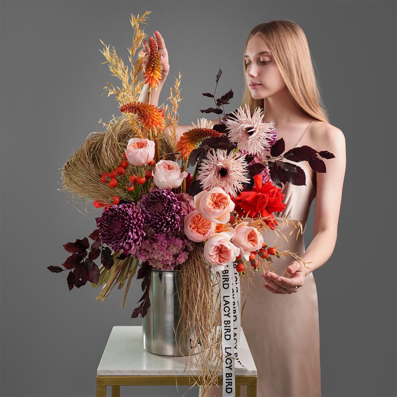 Свежие цветы от Lacy Bird доставляются в фирменной упаковке, которую необходимо снять при установке в вазу. Не срезайте ленту, связывающую букет для сохранения формы.