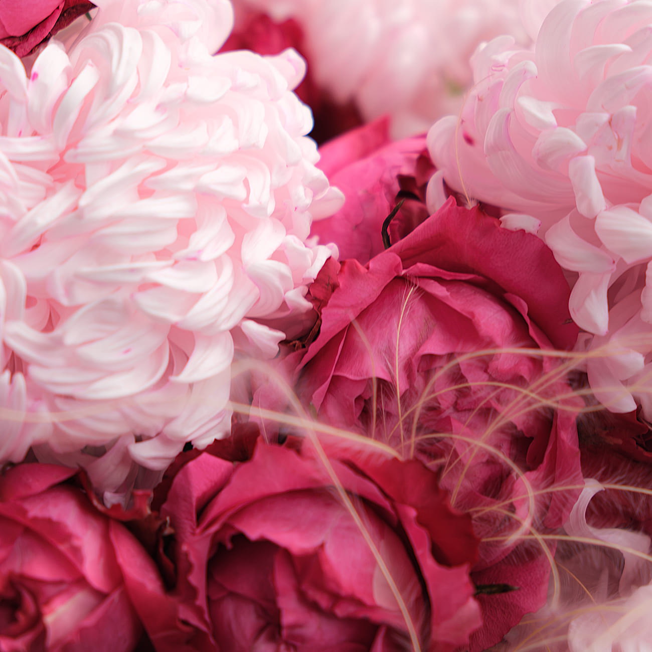 Погрузитесь в мир нежных и ярких красок с нашим букетом из кустовых роз и хризантем. Сочетание насыщенных малиновых кустовых роз и воздушных нежно-розовых хризантем создает гармоничный и при этом динамичный дуэт.