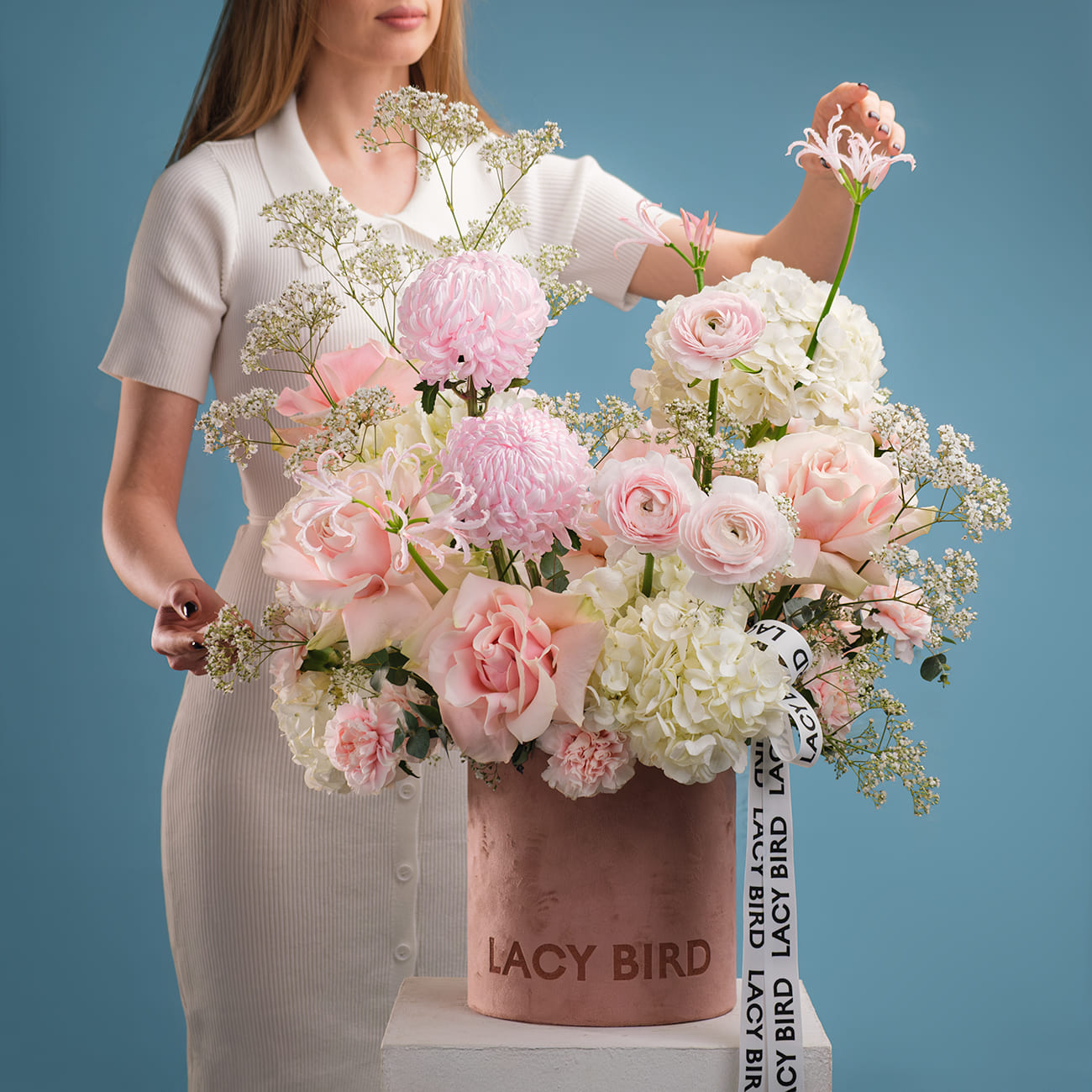 Ранункулюсы с их многослойными, словно шелковыми бутонами, добавляют композиции роскоши и глубины. Нежно-розовые розы и хризантемы привносят мягкие, романтичные акценты. Легкое облако из белой гипсофилы окутывает коробку невесомостью и светом.