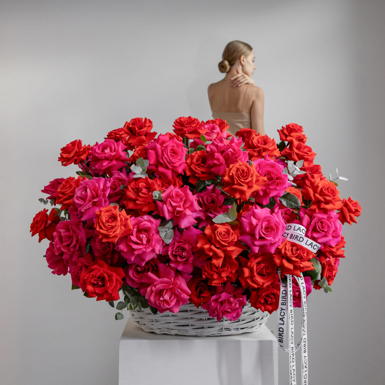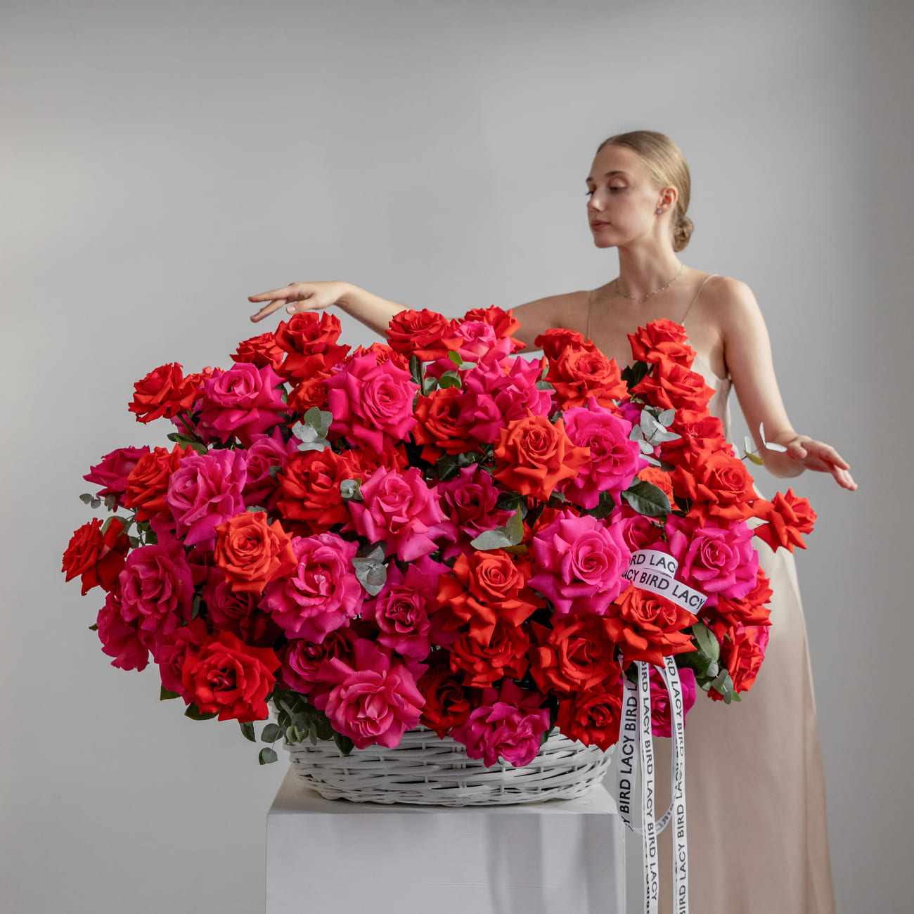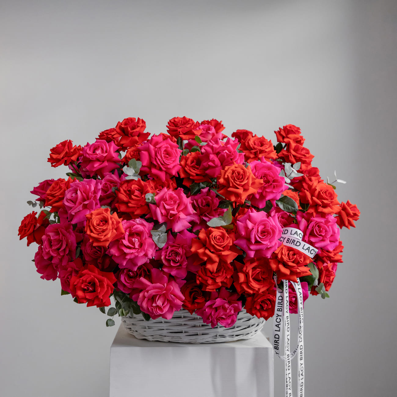 Откройте для себя роскошь с корзиной ароматных французских роз Pink Floyd и Nina! Эти ярко-красные и насыщенно-розовые розы, собранные в элегантной плетеной корзине, воплощают страсть и элегантность. Зелёные листья эвкалипта добавляют композиции естественности и свежести, создавая эффект полного цветения.
