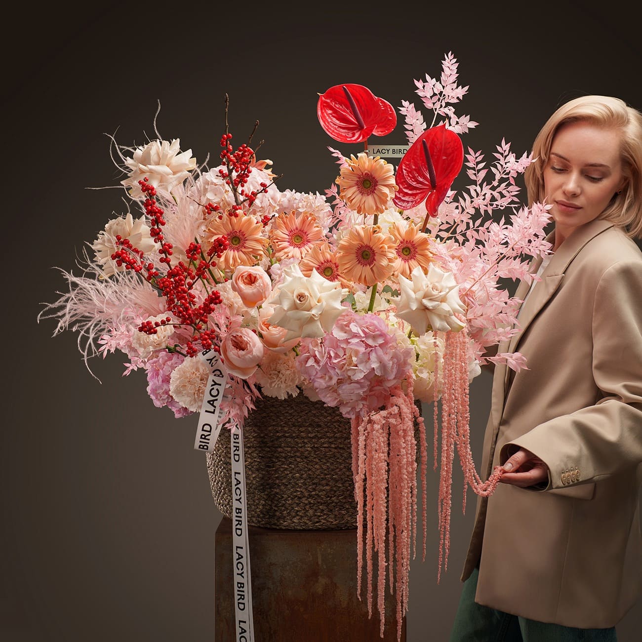 Свежие цветы от Lacy Bird доставляются в фирменной упаковке, которую необходимо снять при установке в вазу. Не срезайте ленту, связывающую букет для сохранения формы.