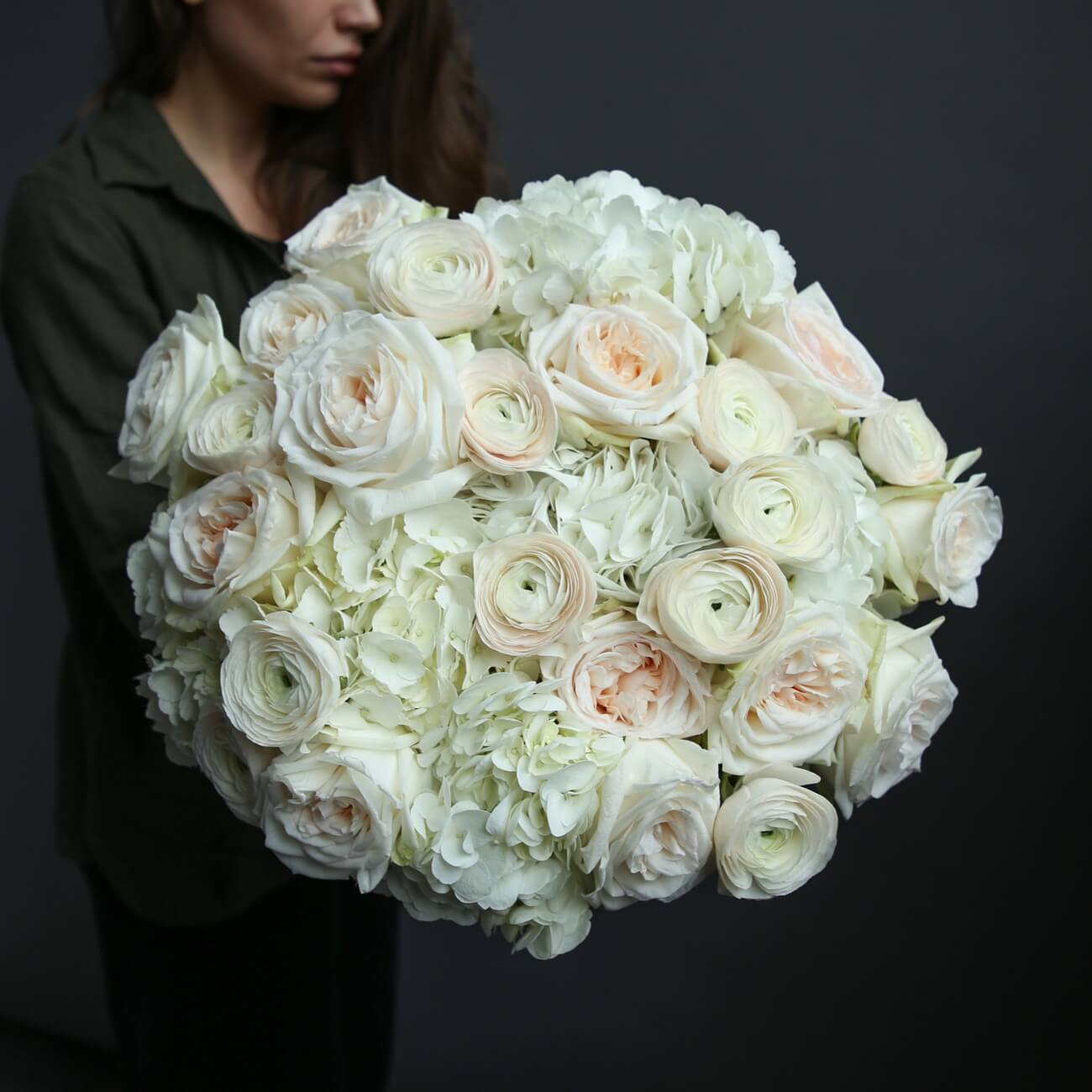 Триобукет из ранункулюсов, гортензии и пионовидных роз