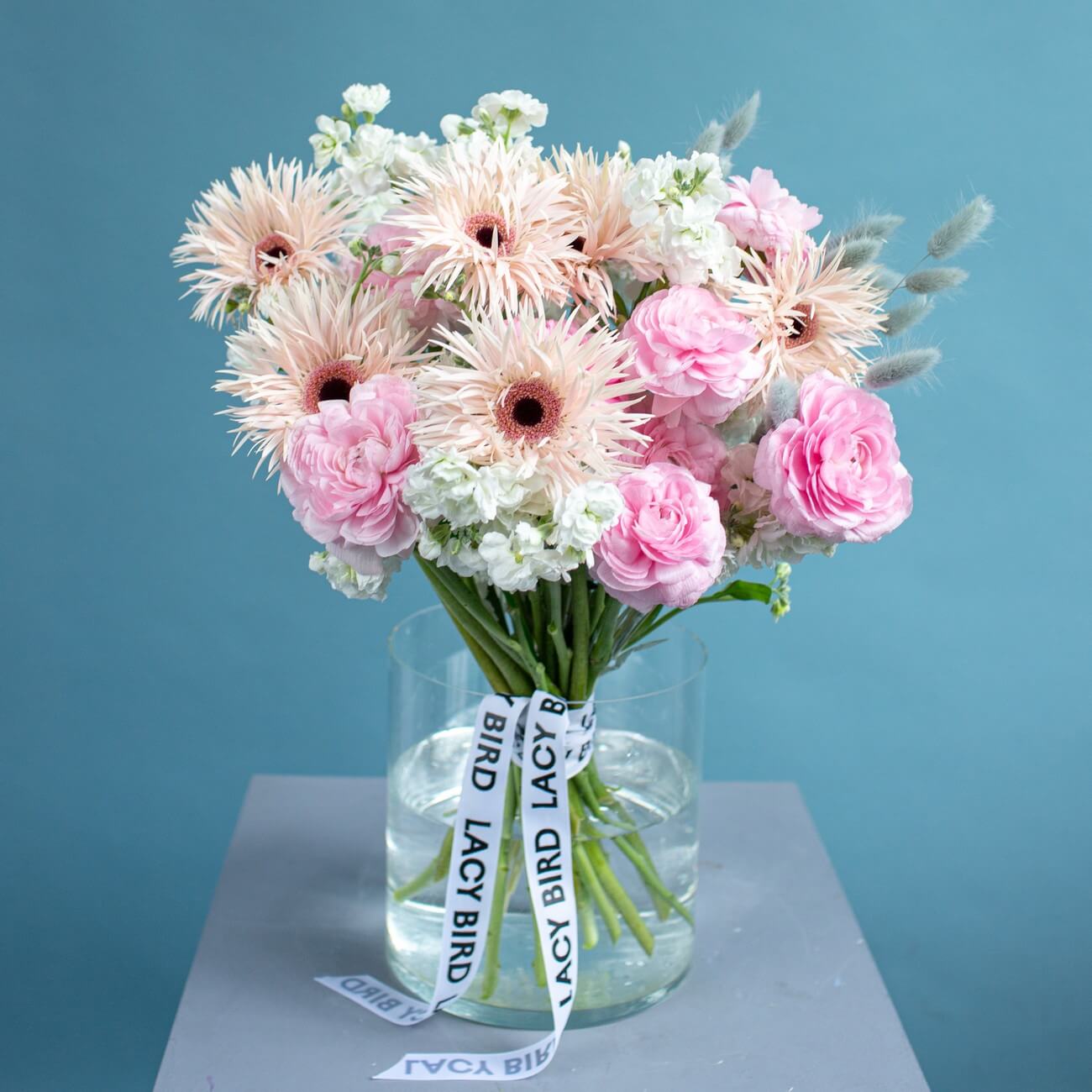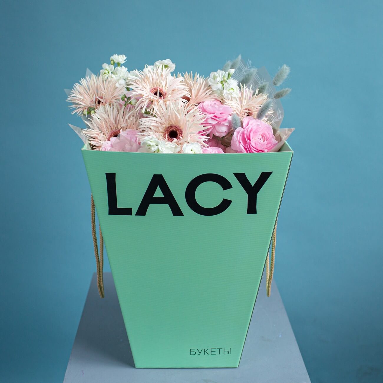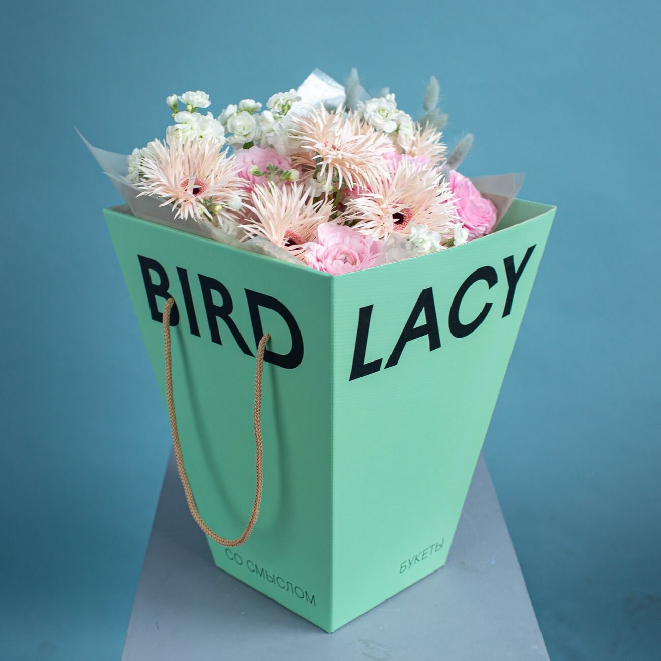 Свежие цветы от Lacy Bird доставляются в фирменной упаковке, которую необходимо снять при установке в вазу. Не срезайте ленту, связывающую букет для сохранения формы.
