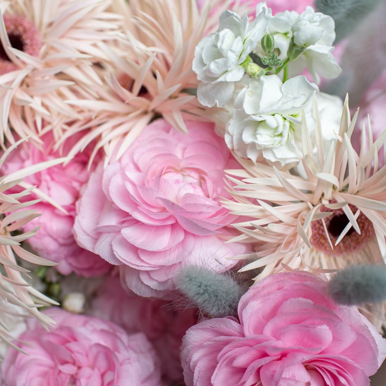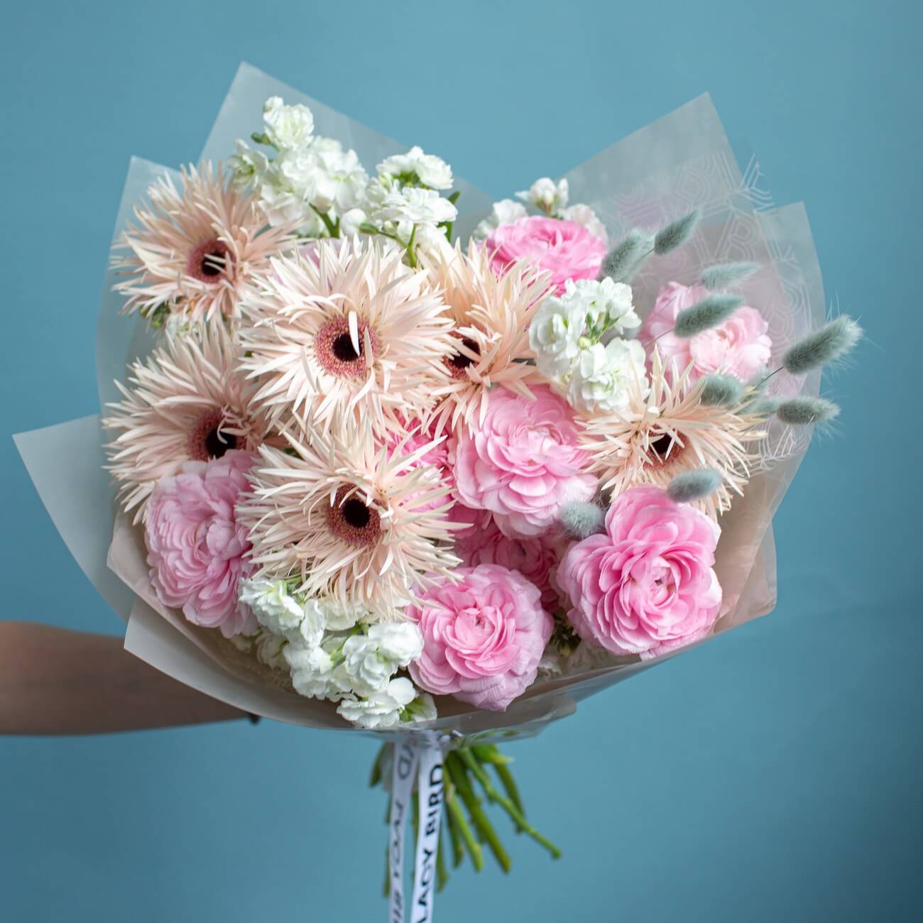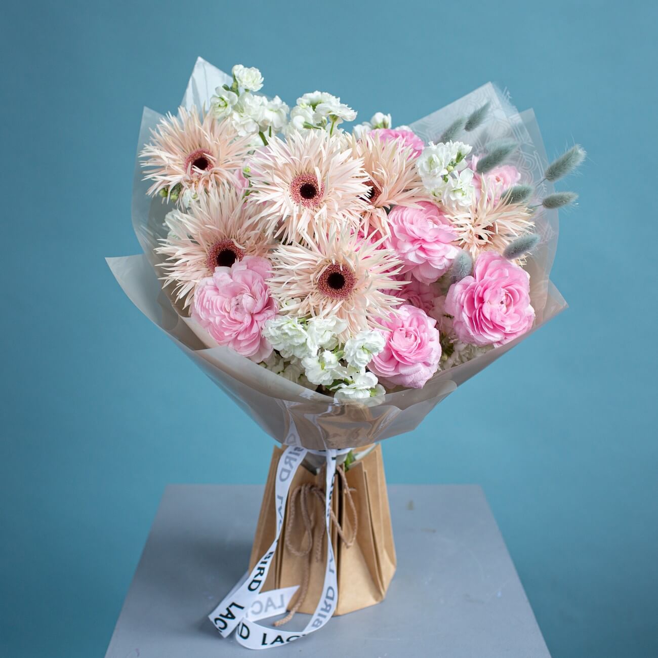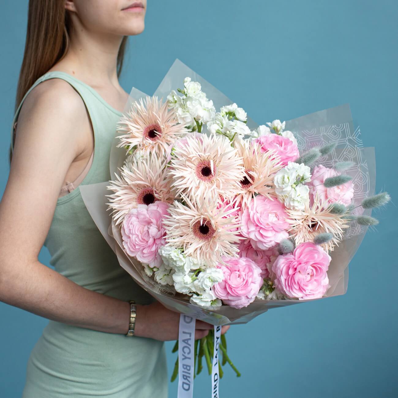Свежие цветы от Lacy Bird доставляются в фирменной упаковке, которую необходимо снять при установке в вазу. Не срезайте ленту, связывающую букет для сохранения формы.