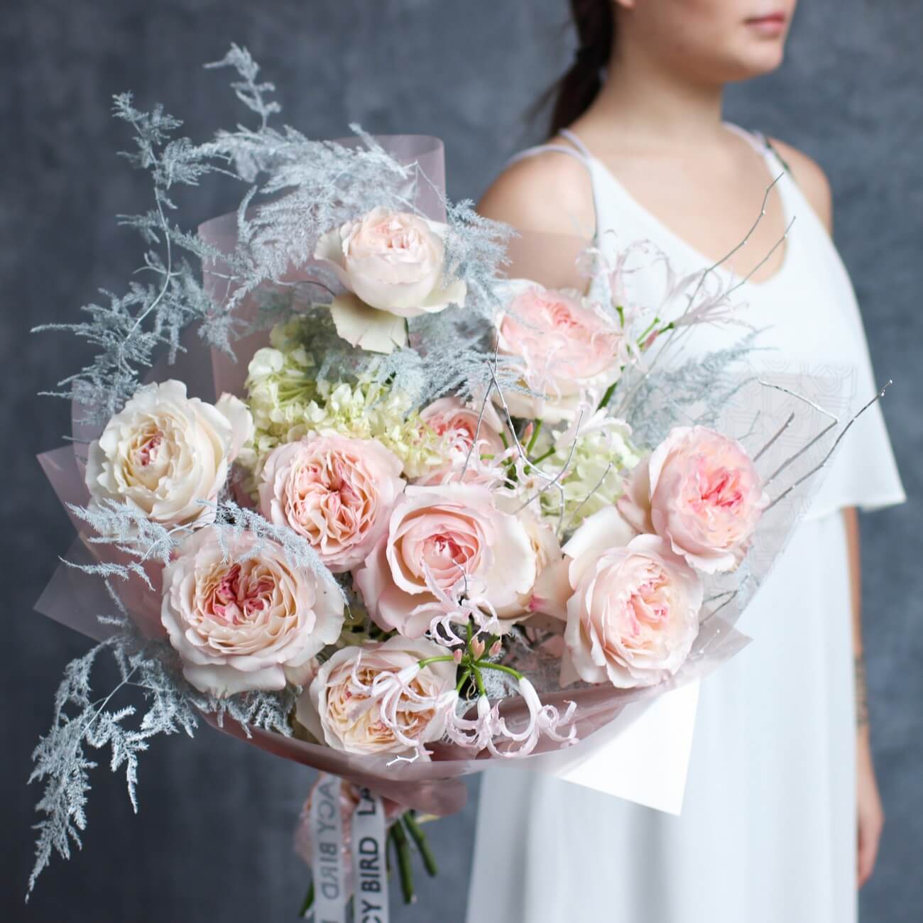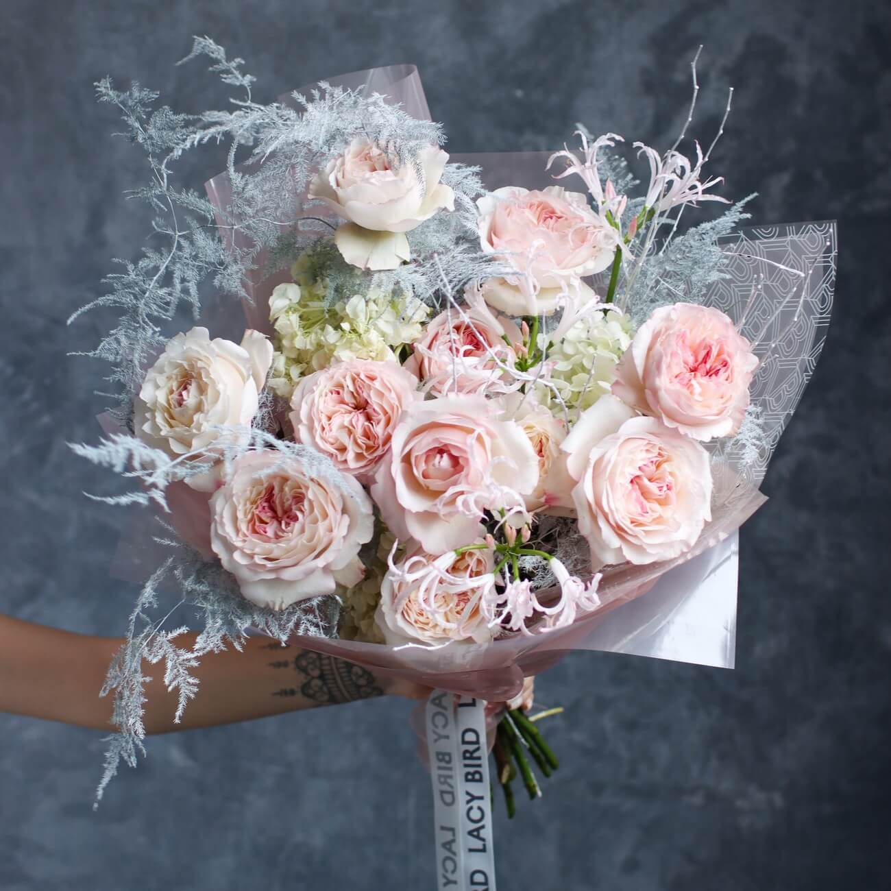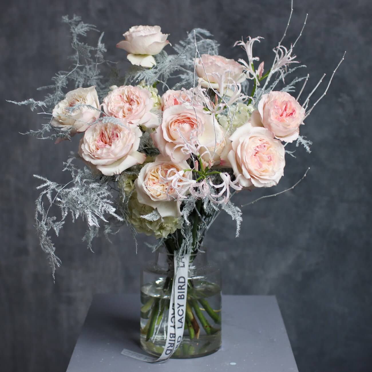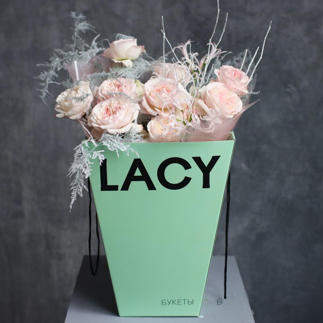 Свежие цветы от Lacy Bird доставляются в фирменной упаковке, которую необходимо снять при установке в вазу. Не срезайте ленту, связывающую букет для сохранения формы.